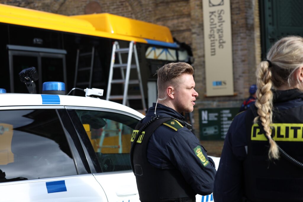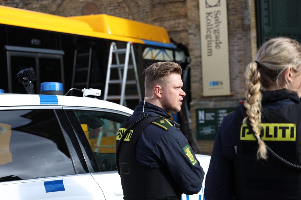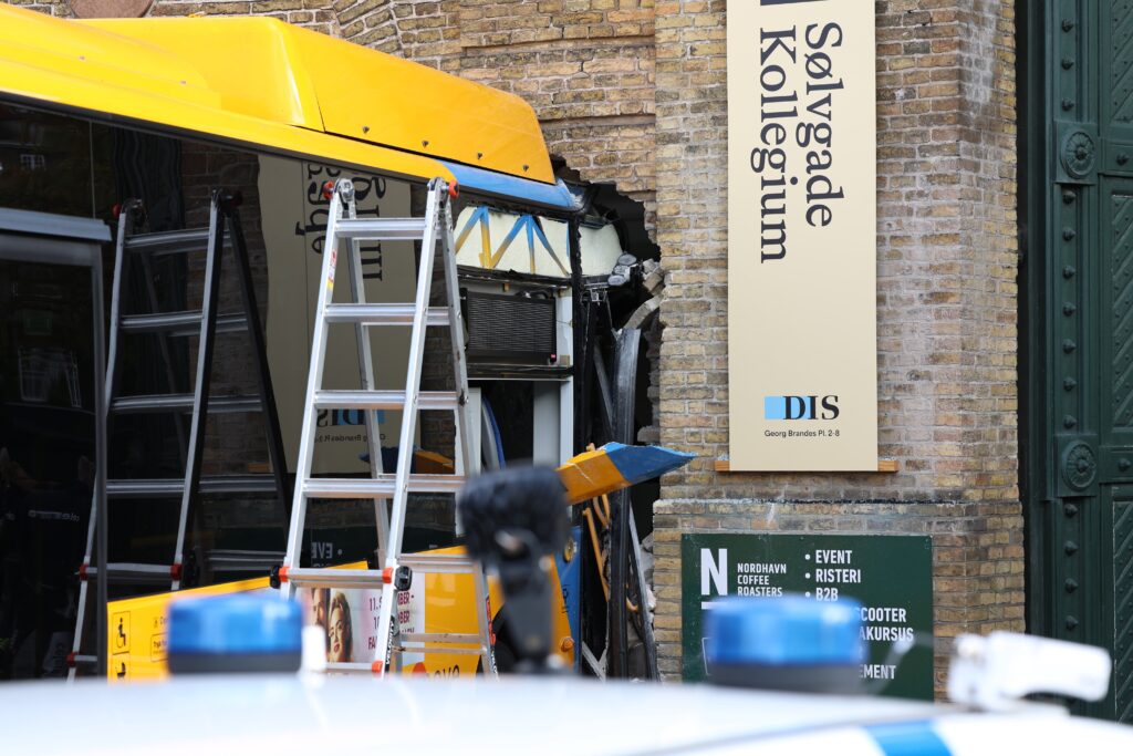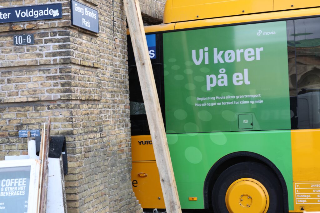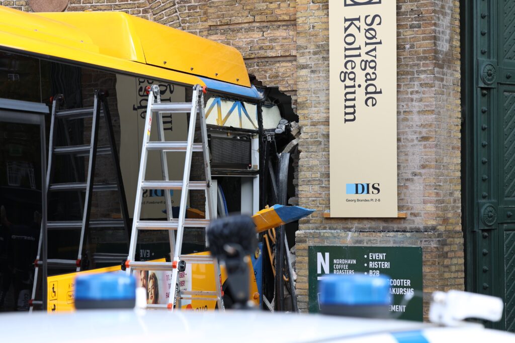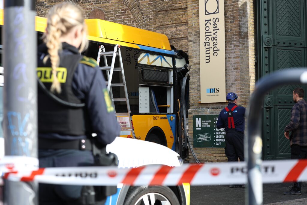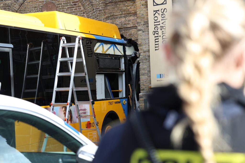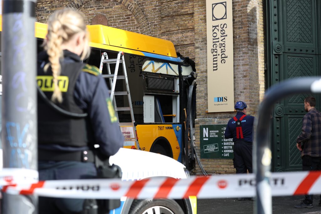 En bus er kørt ind i facaden på en bygning i krydset ved Øster Voldgade og Sølvgade i København søndag morgen.