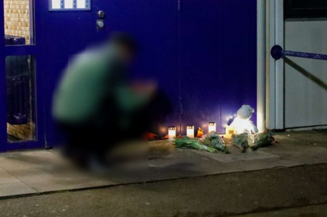 Blomster, lys og en bamse er placeret for foden af bygningen