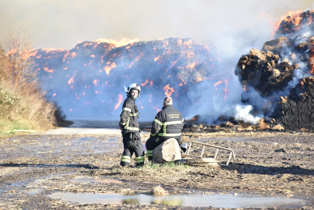 Brandvæsenet har iværksat en kontrolleret nedbrænding, efter at der er gået ild i halmballer på Falster.