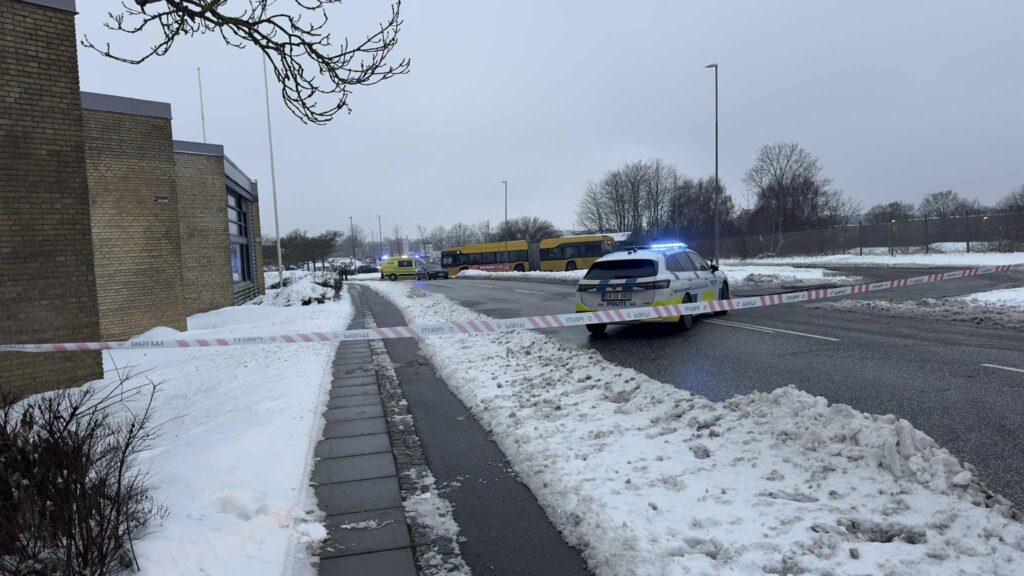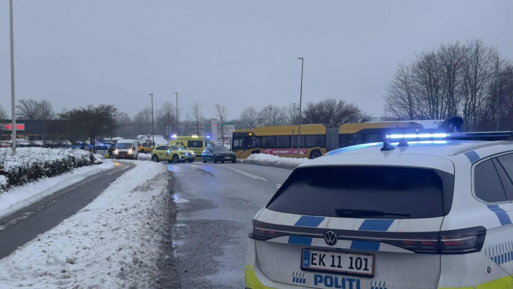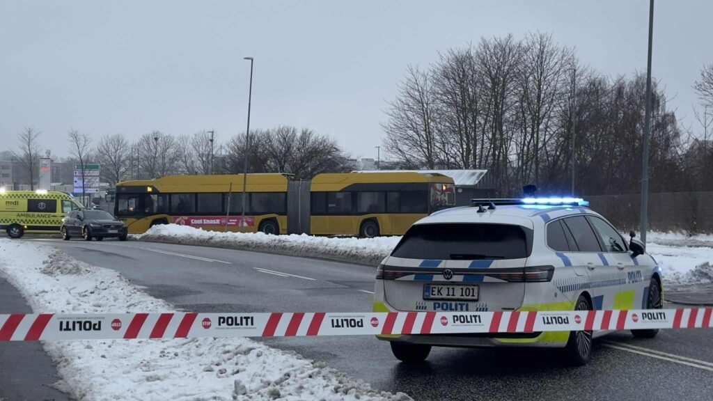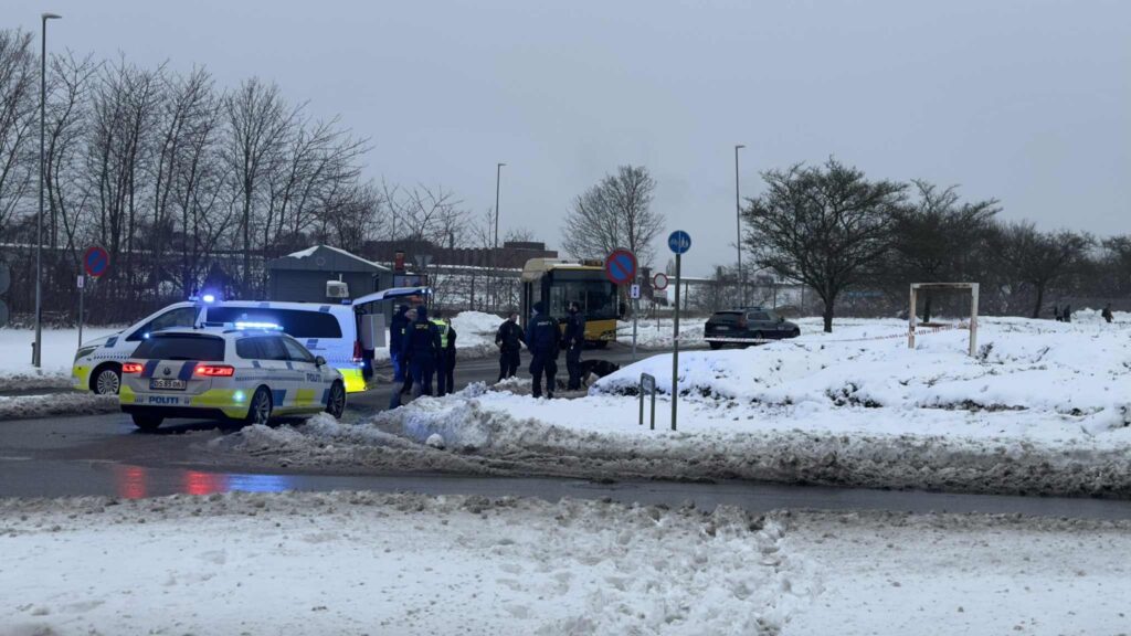 På stedet holder en bus helt stille, mens politiet har overtaget området og arbejder intensivt.