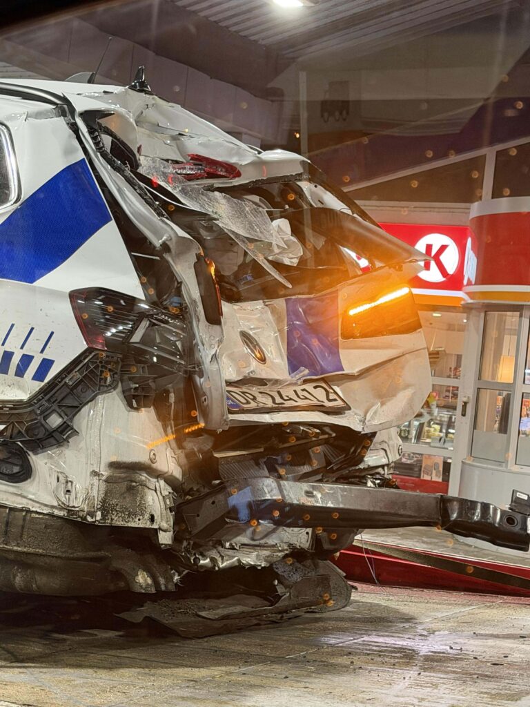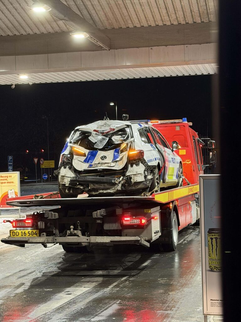 Politikøretøj blev ramt af lastbil, da politiet var rykket ud til en glatføreulykke. En person er indlagt.