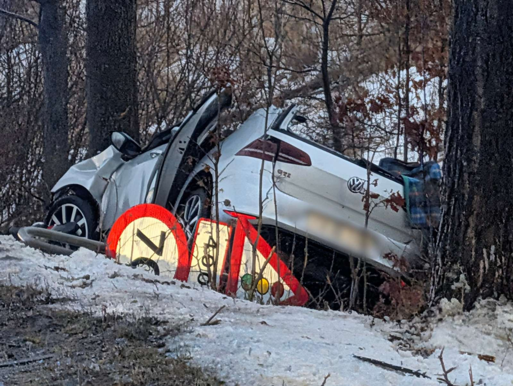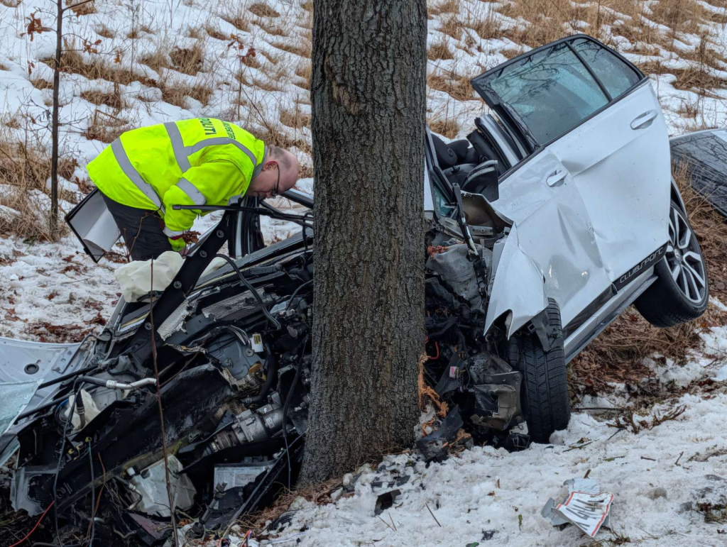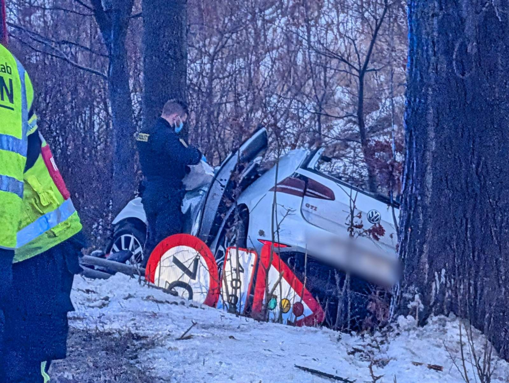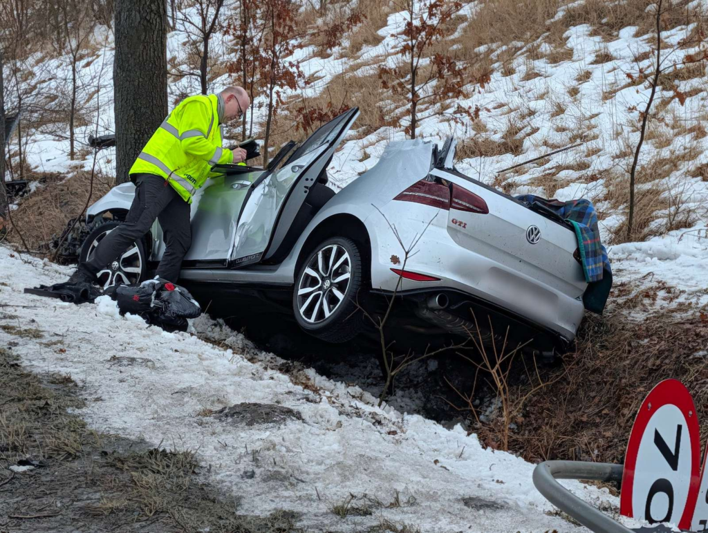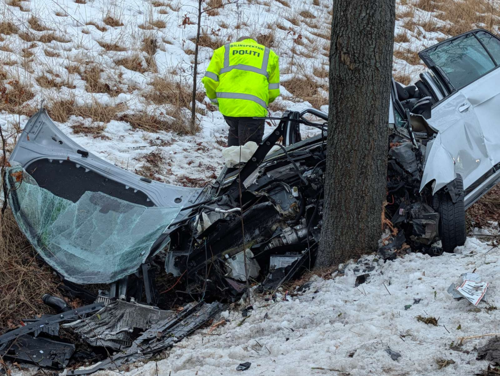 I den snedækkede grøft holder en personbil, som er hamret direkte ind i et træ. Personbilen er fuldstændig ødelagt og klippet i stykker af redningsmandskabet, som har arbejdet på at få kvæstede ud af køretøjet.