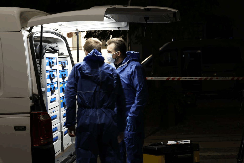 ‘I de store afspærrede område var også flere teknikere i blå DNA-dragter ankommet.’