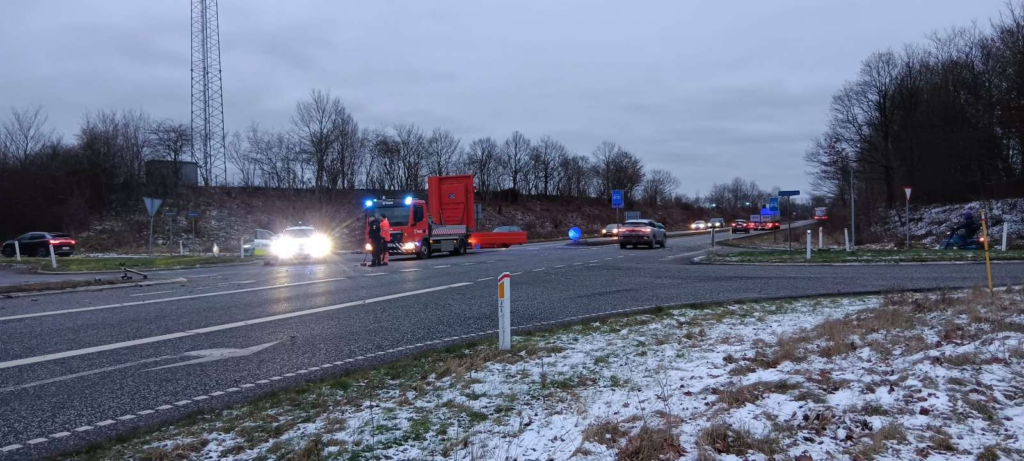 I forbindelse med uheldet har politiet måtte afspærre vejen. Der meldes om, at man skal forvente kø på op til 30 minutter.