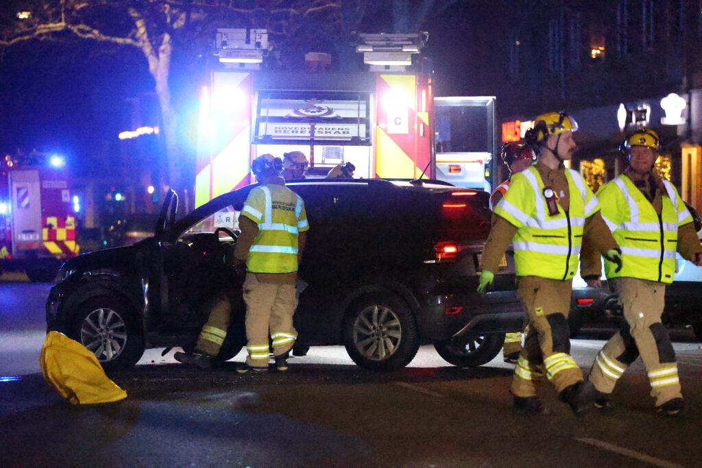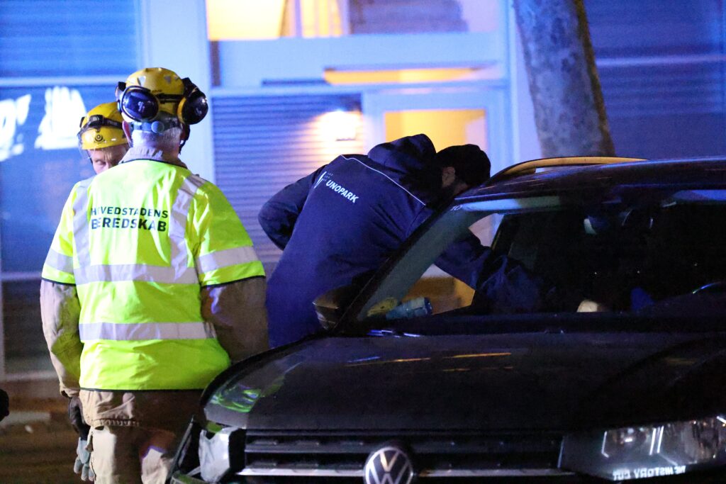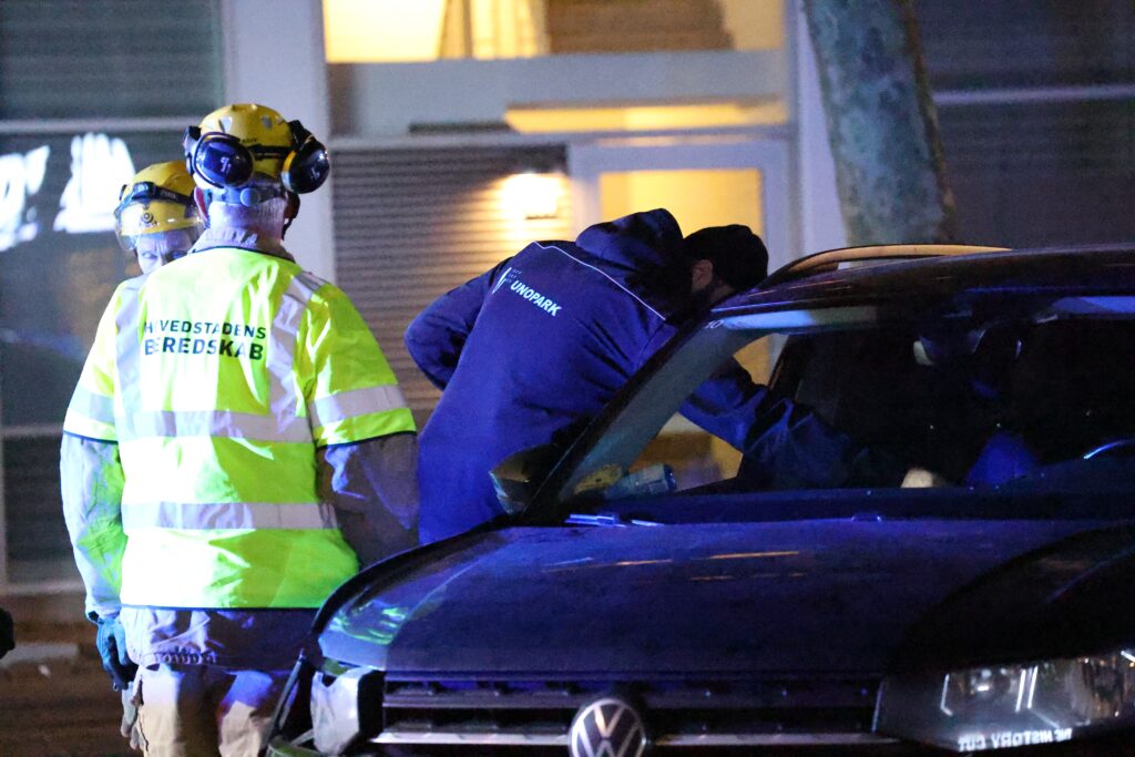 Mere præcist er det ved Amagerbrogade 251, at politi og redning nu arbejder ved den forulykkede bil.