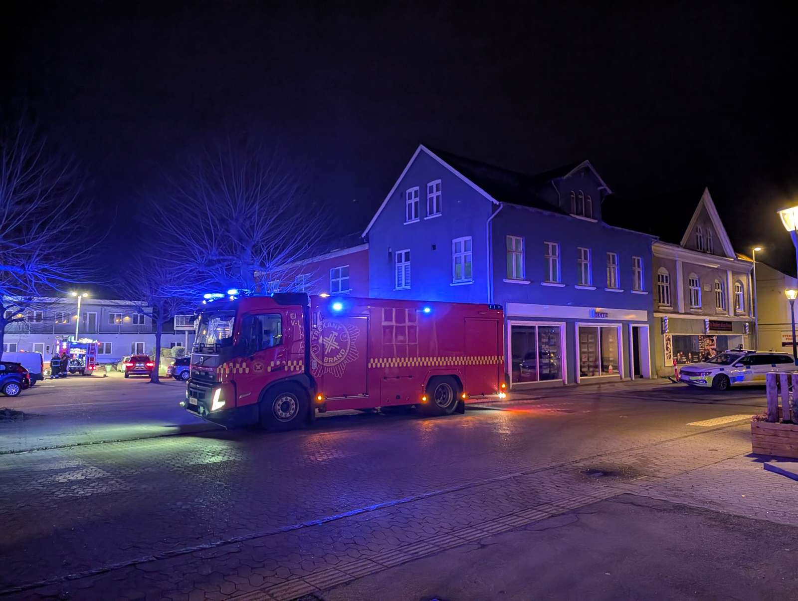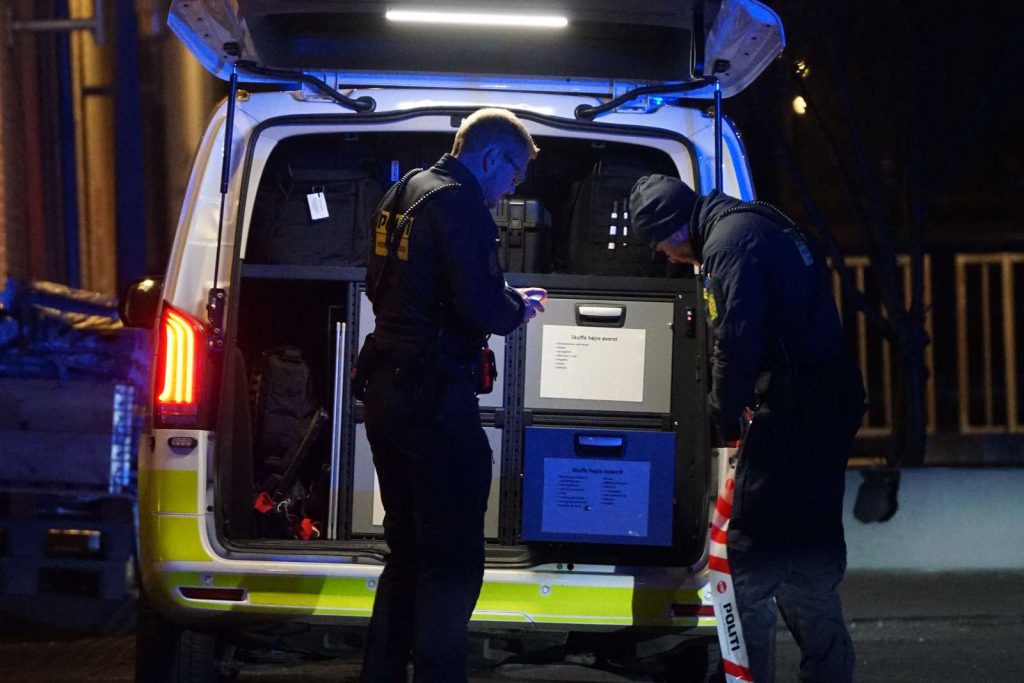 Politiet er også til stede, hvor der er sat afspærringstape op ved ejendommen, og det formodes, at lejlighedens indgang bliver afspærret i forbindelse med de videre undersøgelser.