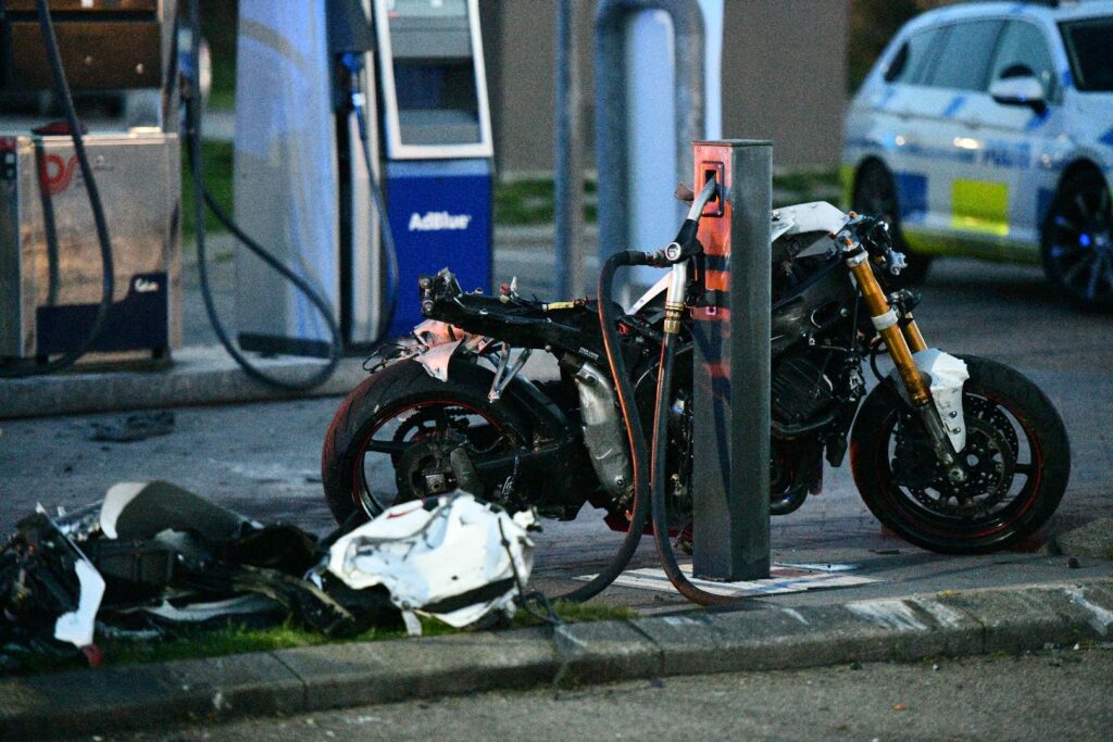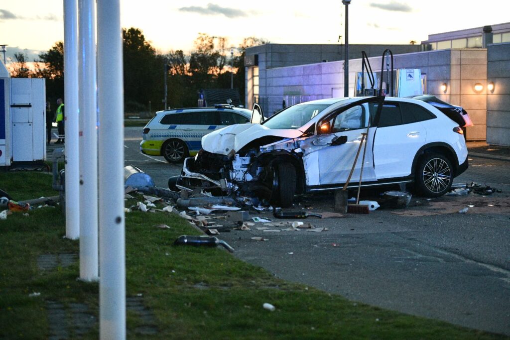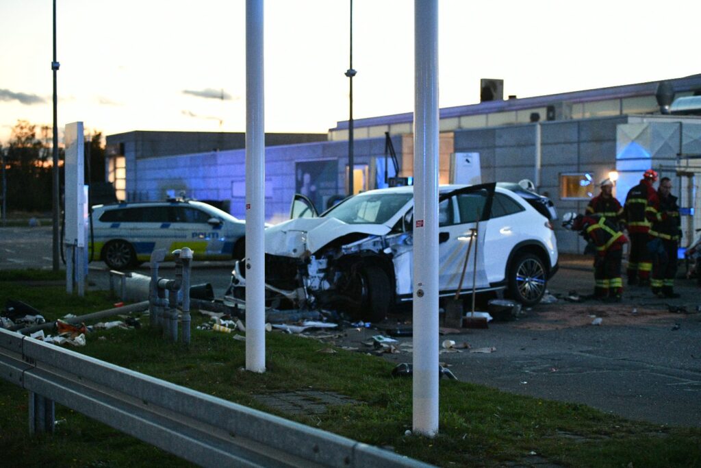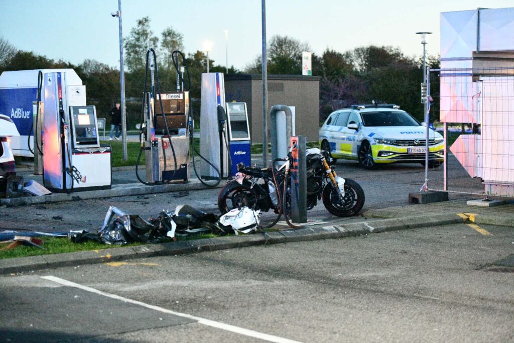 ‘Personbilen har kørt igennem skilte, benzinstander og har også ramt en motorcykel,’ lyder det.