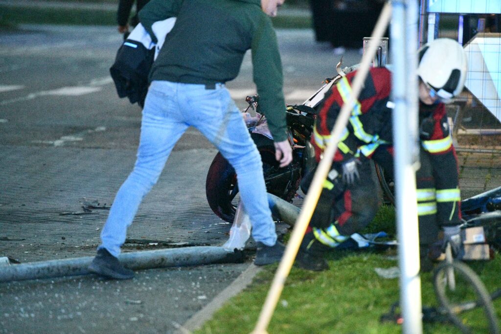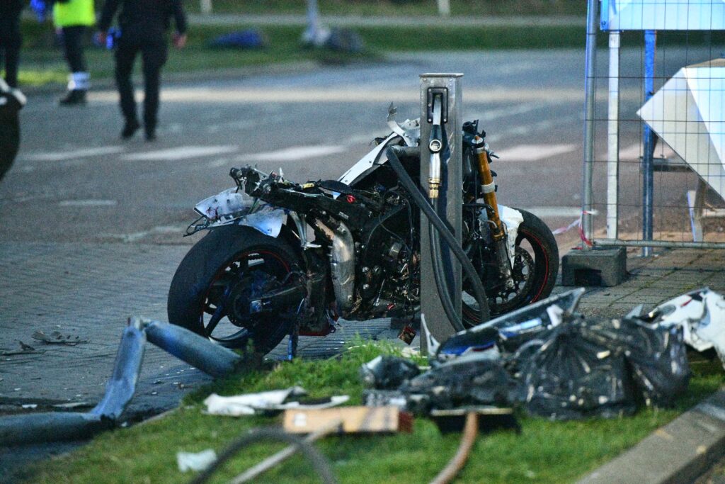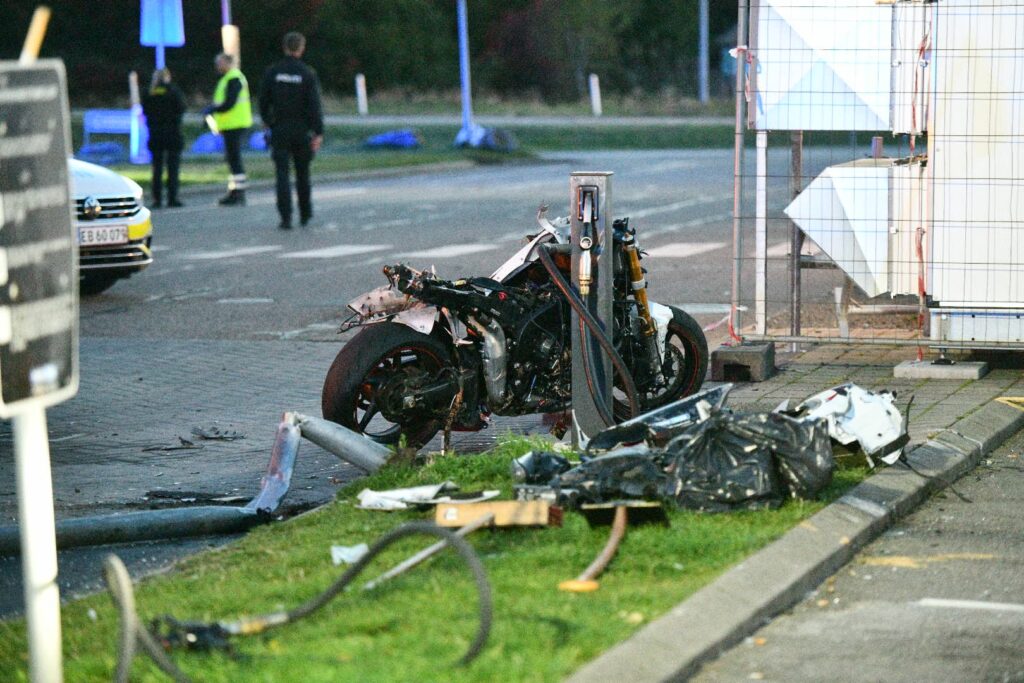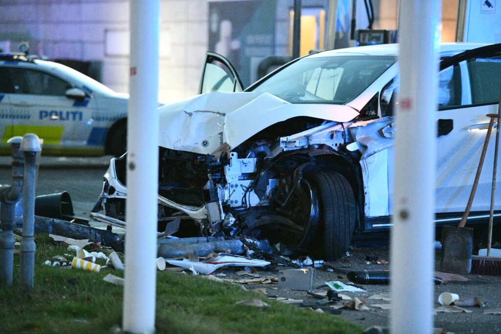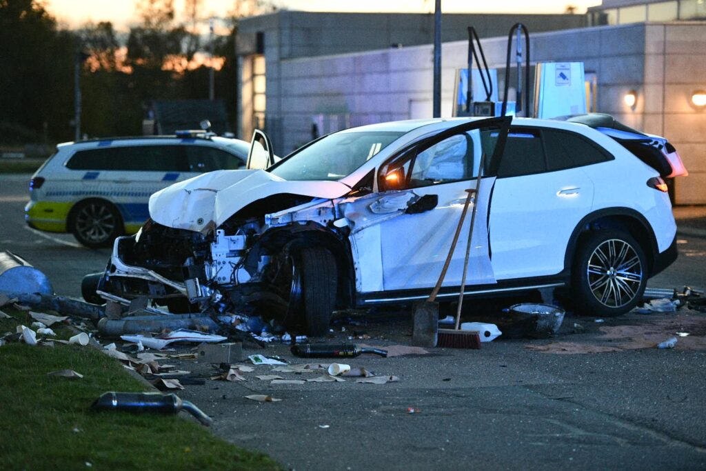 ‘Personbilen har kørt igennem skilte, benzinstander og har også ramt en motorcykel,’ lyder det.