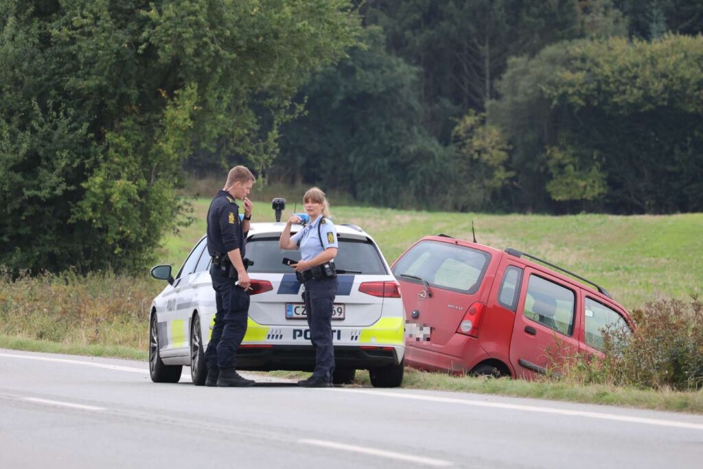 Lørdag ligger en forulykket bil i grøften, efter et færdselsuheld. Politiet har trukket afspærringsbånd rundt om det røde køretøj. Føreren af køretøjet er blevet anholdt.