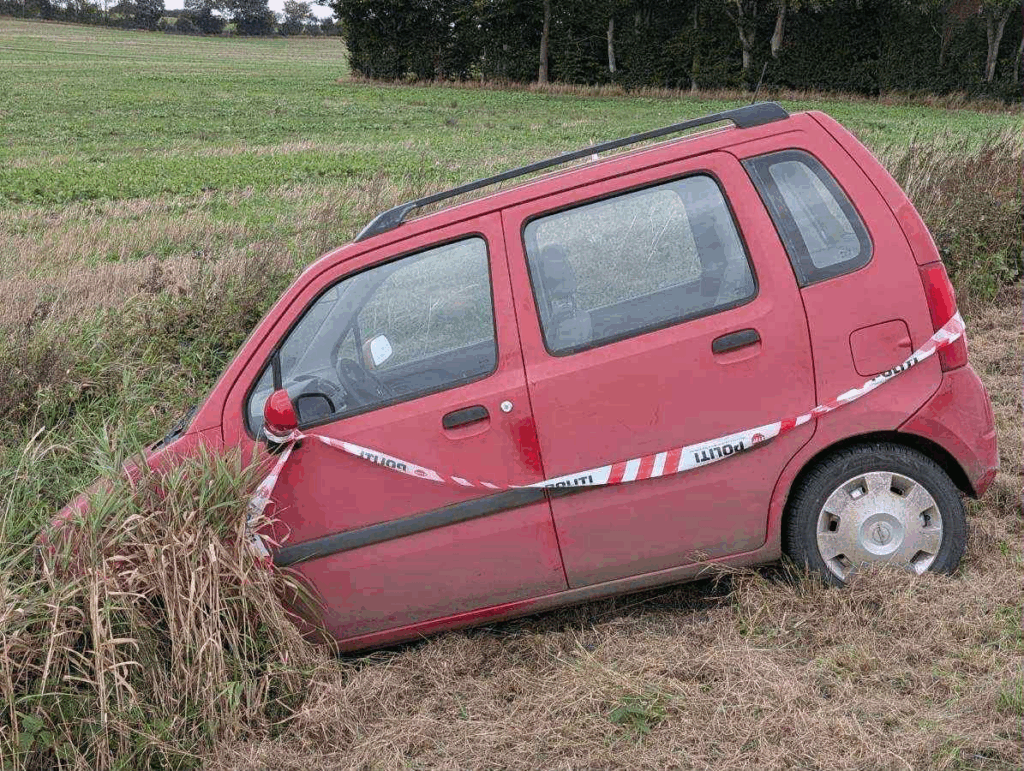 Billeder fra stedet viser, at politiet har afspærret bilen, der lå i en grøft nær en længere vej.