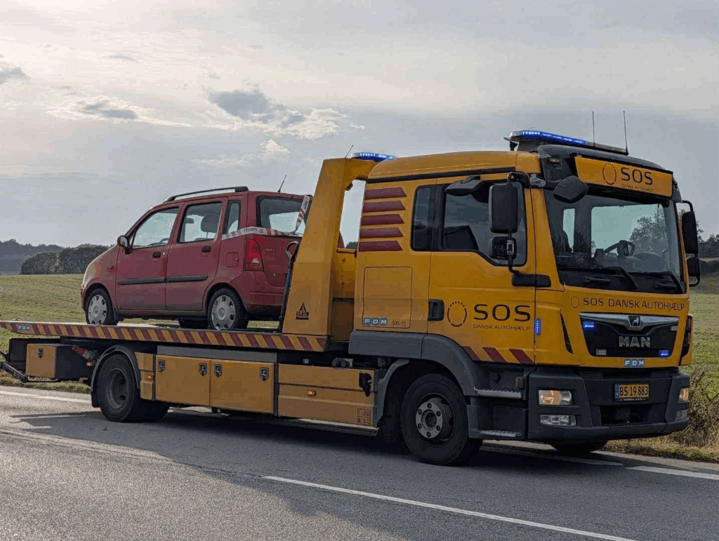 En politipatrulje og et autohjælpskøretøj ankom lørdag eftermiddag ved en forulykket rød bil.