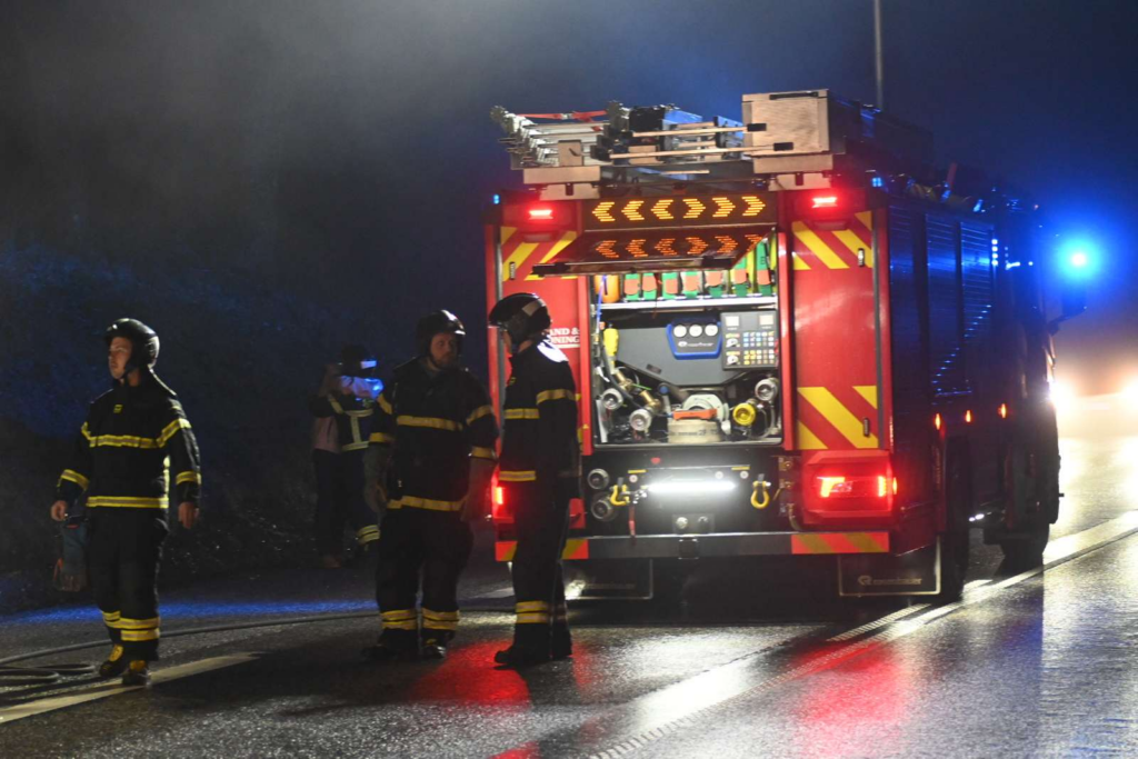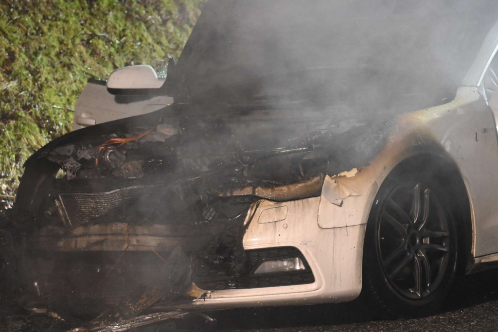 Flammer og røg kunne ses fra køretøjet, og området bar præg af aktivitet fra beredskabet, mens slukningsarbejdet stod på. Brandfolk arbejdede omkring bilen for at forhindre, at ilden spredte sig yderligere.