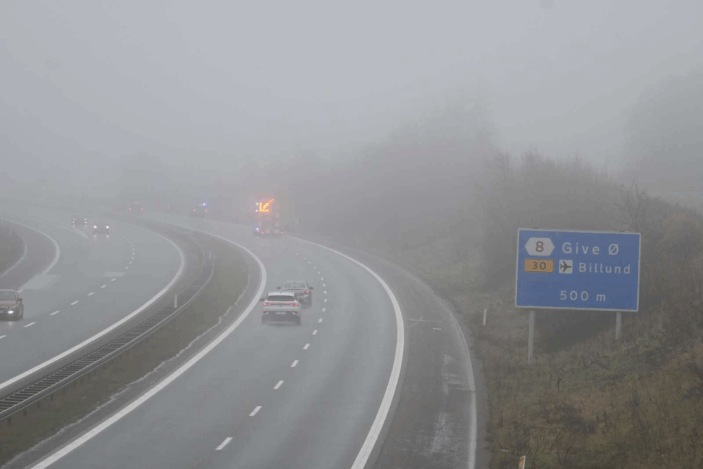 Hændelsen fandt sted på Den Midtjyske Motorvej ved Give, hvor branden lige nu spærrer et spor spærret i retningen forbi stedet, mens slukningsarbejdet står på.