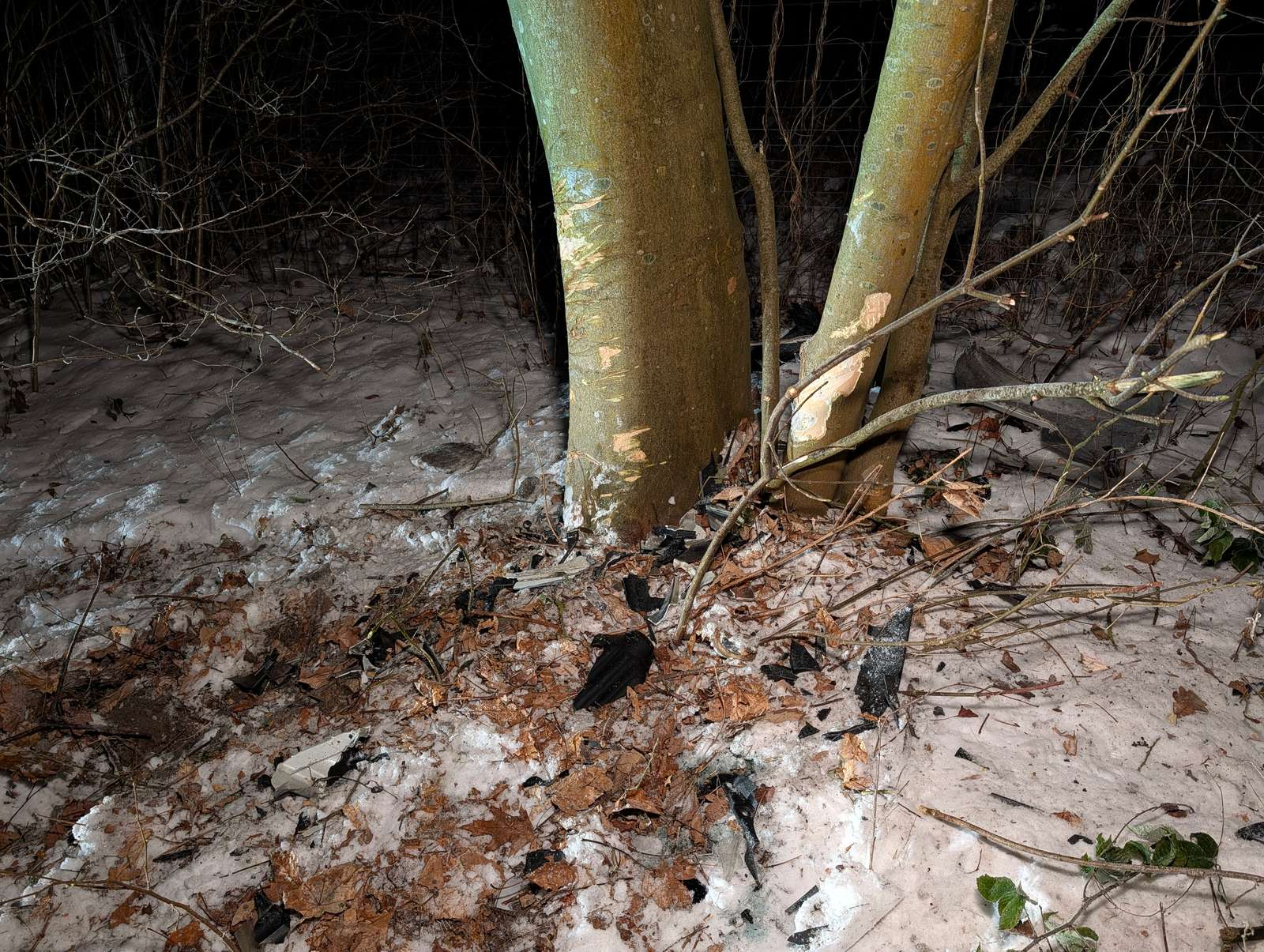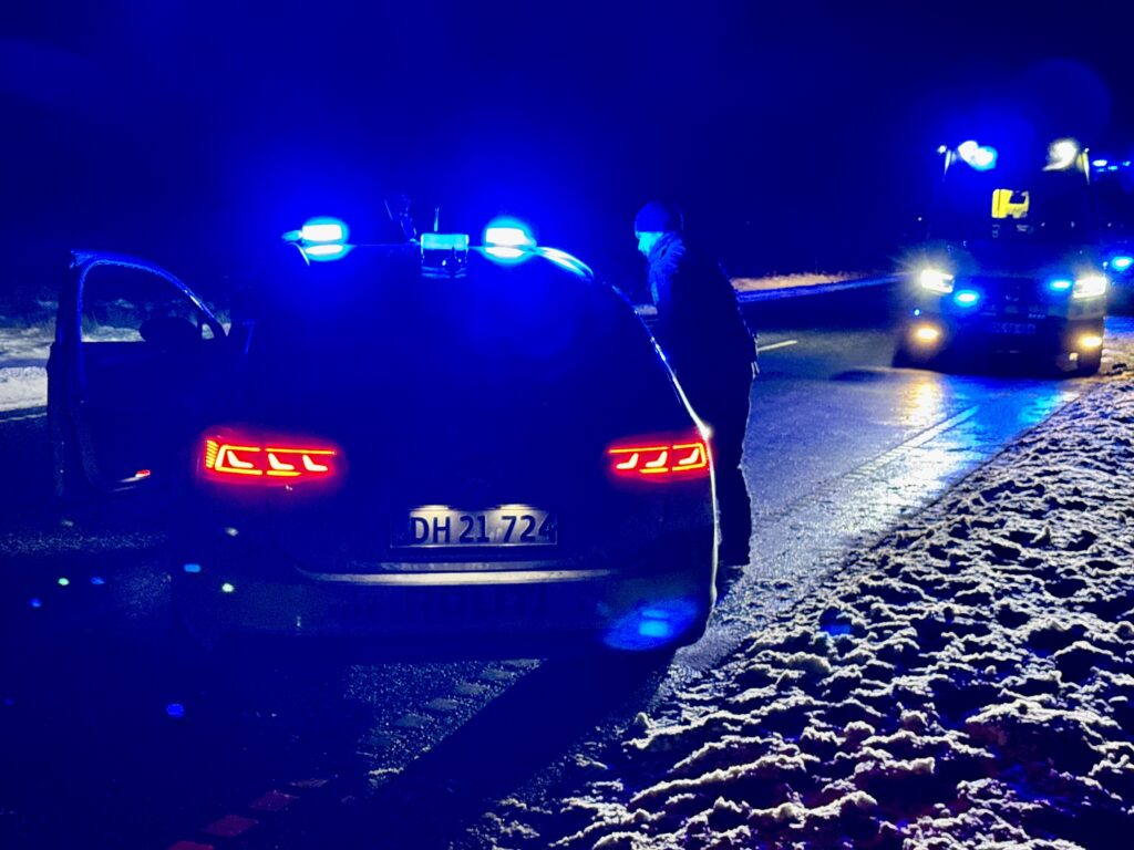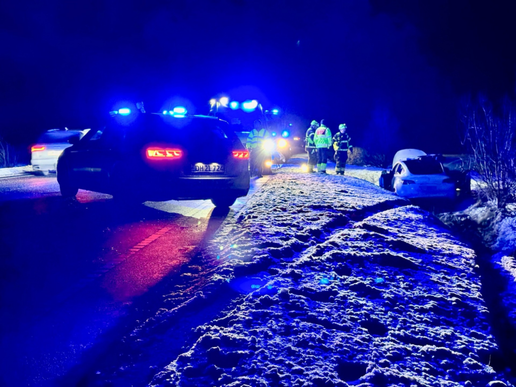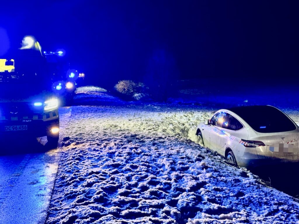 Billeder fra stedet viser en hvid personbil, der holder i grøften langs en vej.