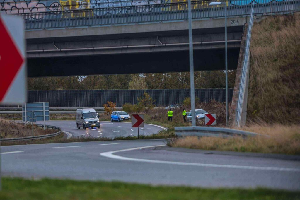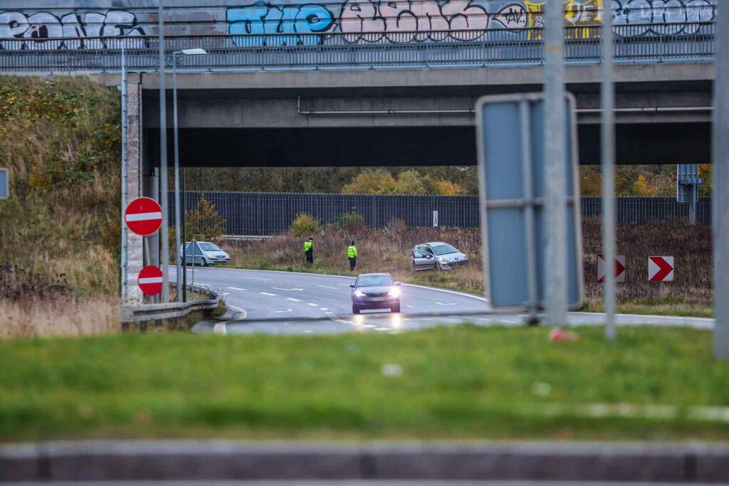 En bil har kørt i relativt høj fart, inden den forlod kørebanen og endte i grøften. Bilister slog straks alarm, og kort efter ankom politi, ambulance og redningsmandskab til stedet.