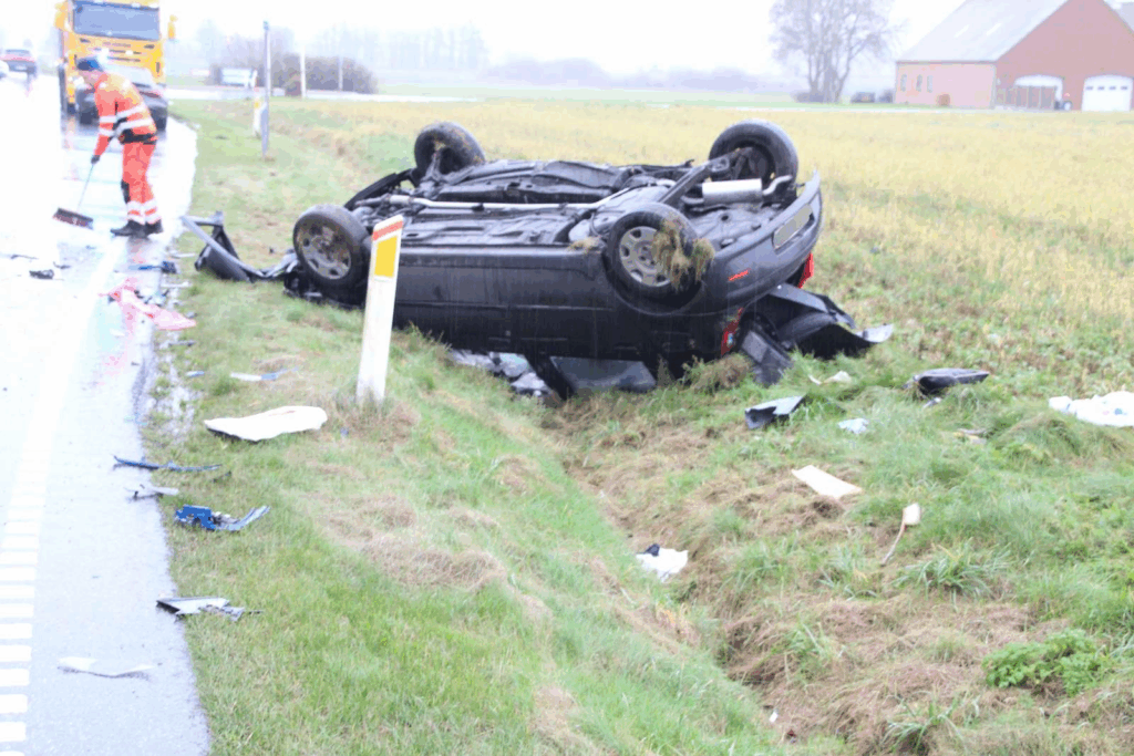 Bil lander på taget i uheld med lastbil: “Person er svært tilskadekommen”