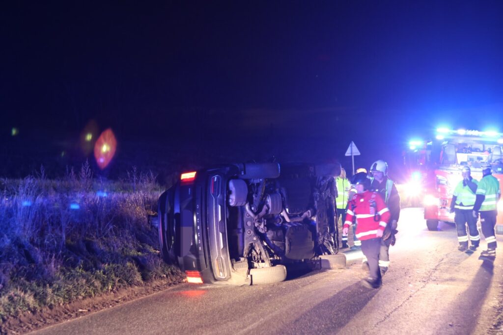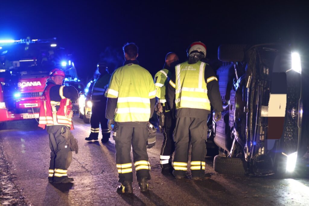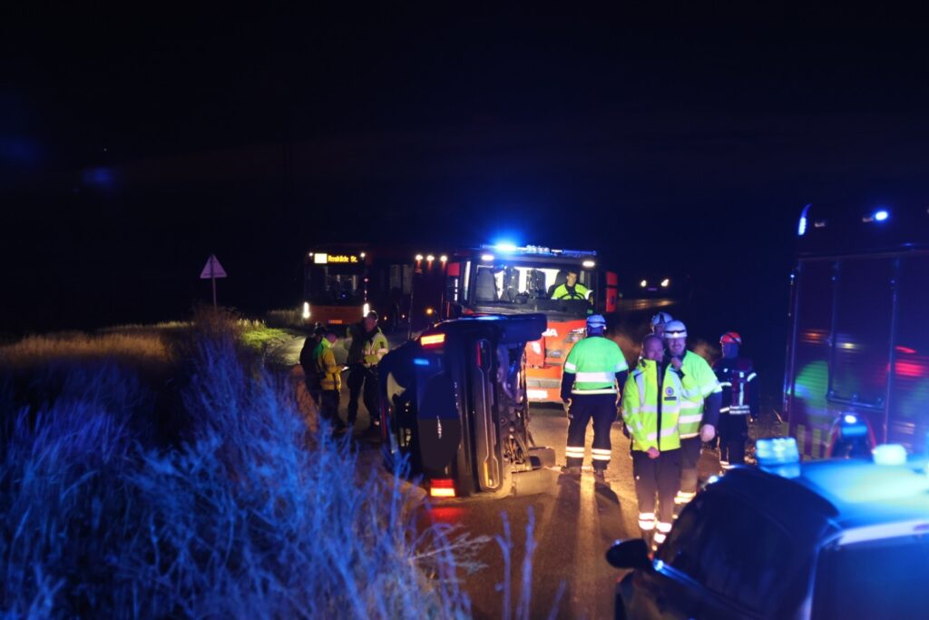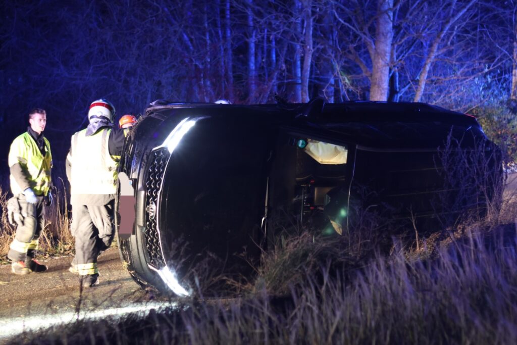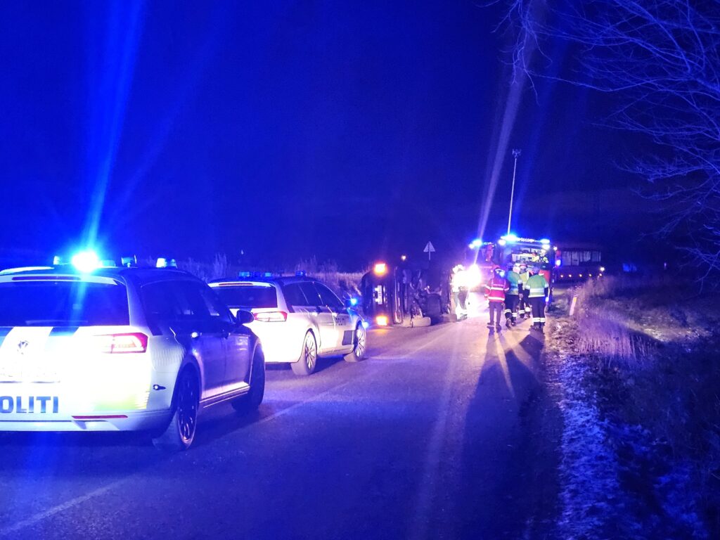 Bilen ligger nu på siden, mens redningspersonale arbejder på stedet. Landevejen, hvor uheldet har fundet sted, er spærret.