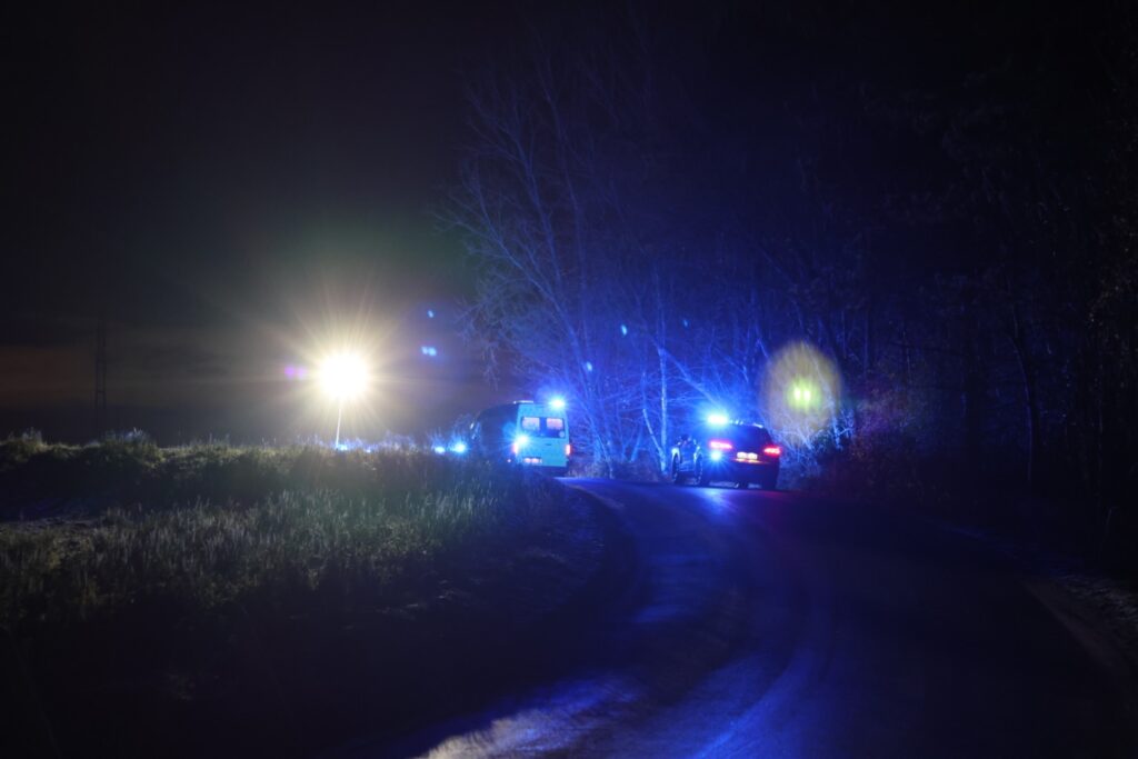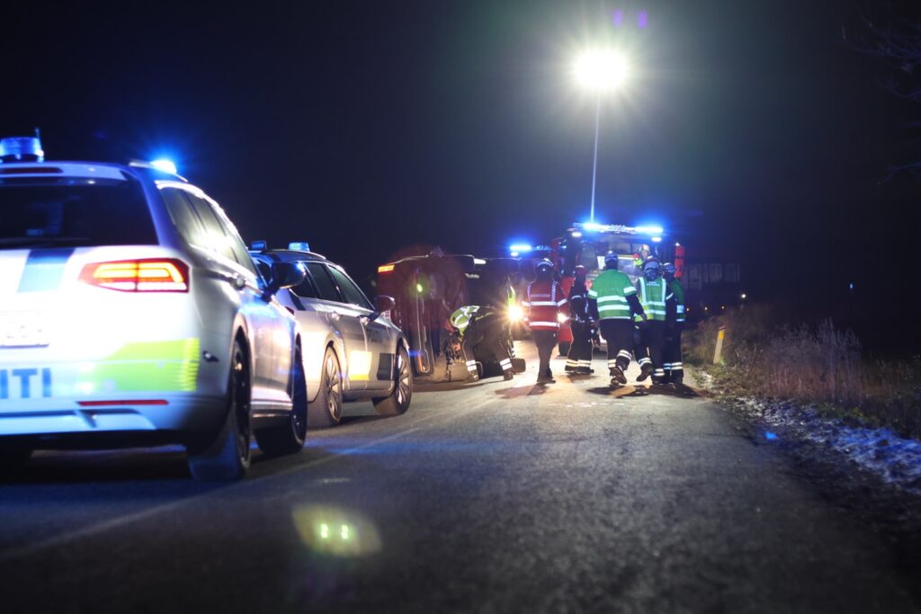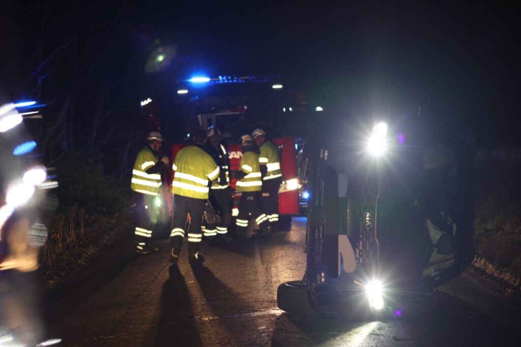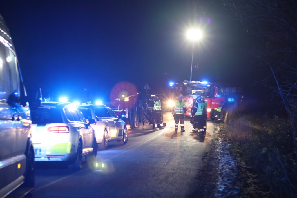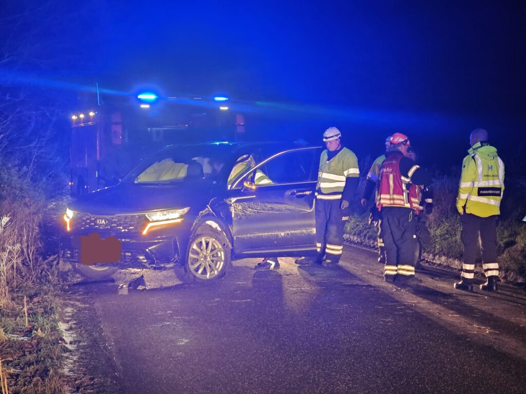 Bilen ligger nu på siden, mens redningspersonale arbejder på stedet. Landevejen, hvor uheldet har fundet sted, er spærret.
