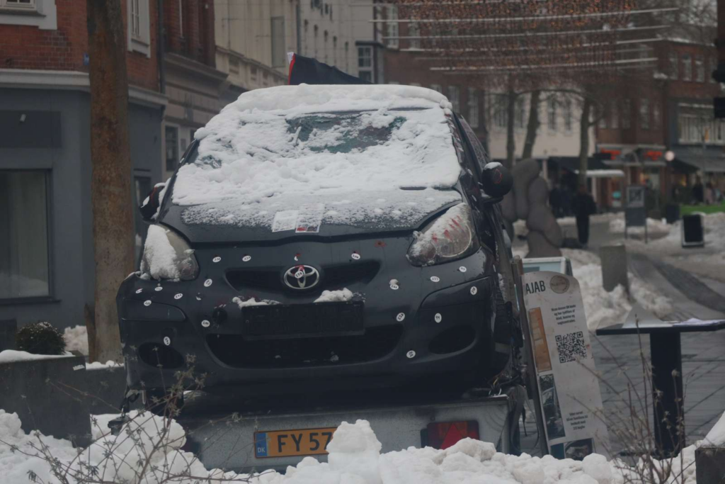 Nu er bilen med 335 skudhuller og blodige aftryk rullet ind på Schweizerpladsen i Slagelse.