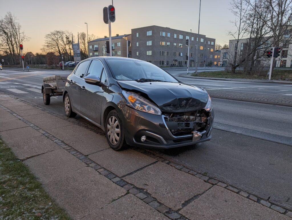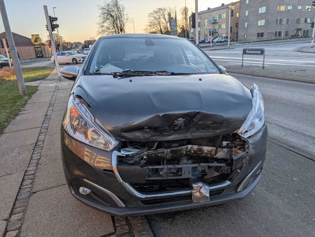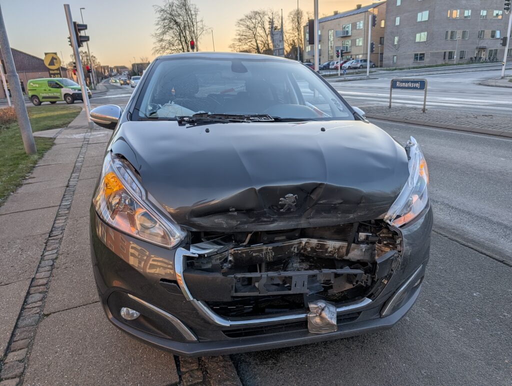 Bilen har lidt stor skade på fronten – se flere billeder nederst i artiklen