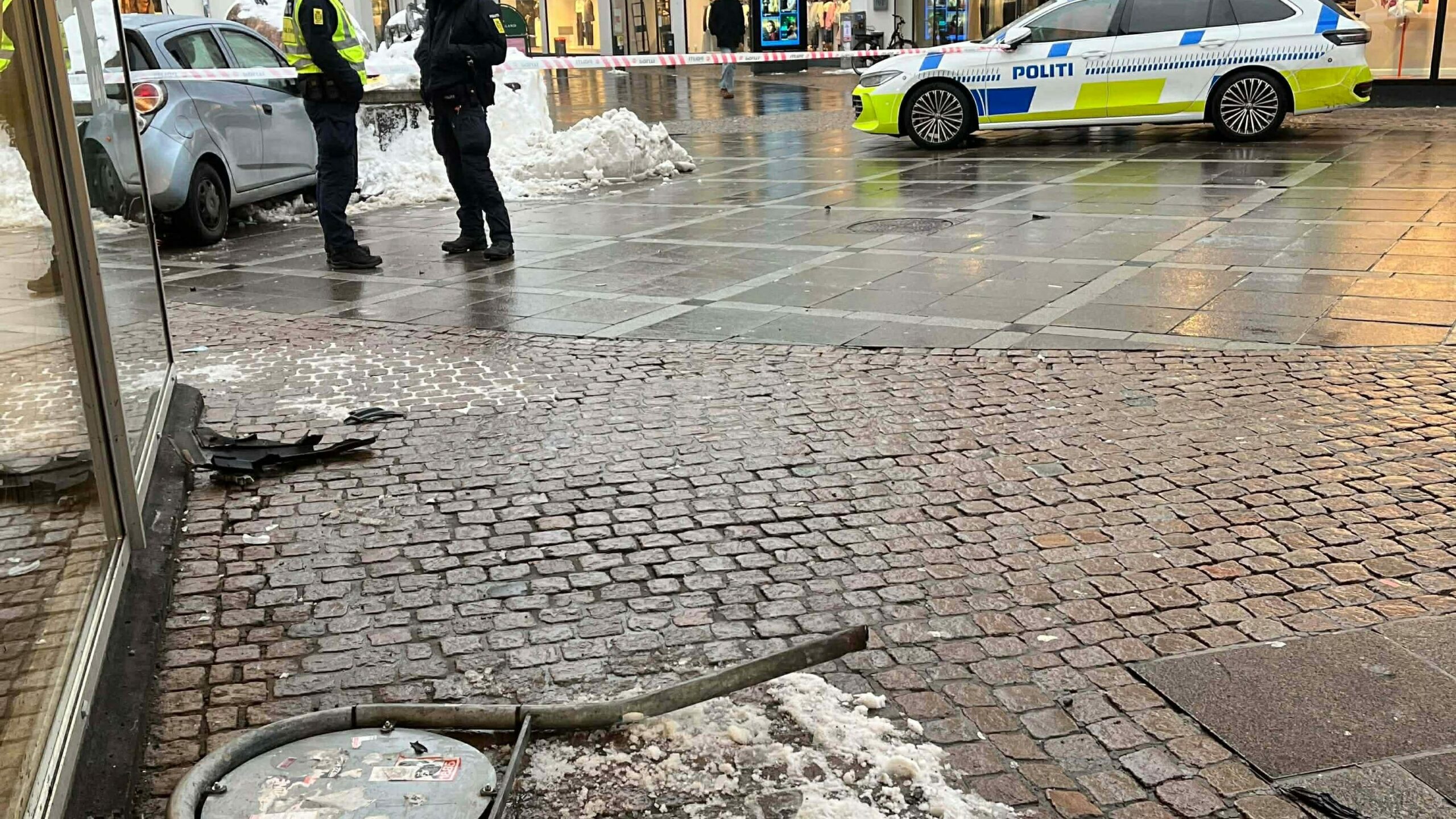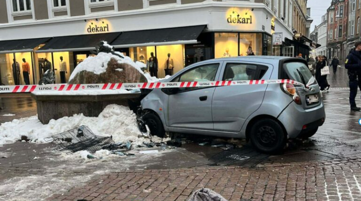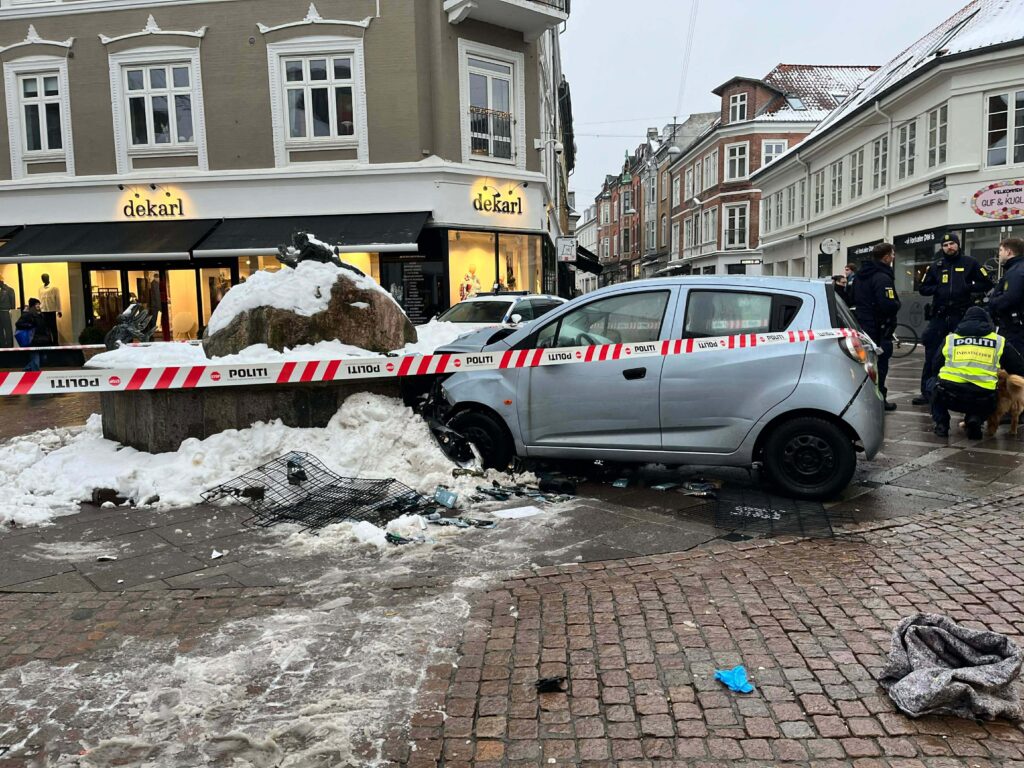 En bil har ramt en statue i gågaden i høj fart. Politi og ambulance på stedet