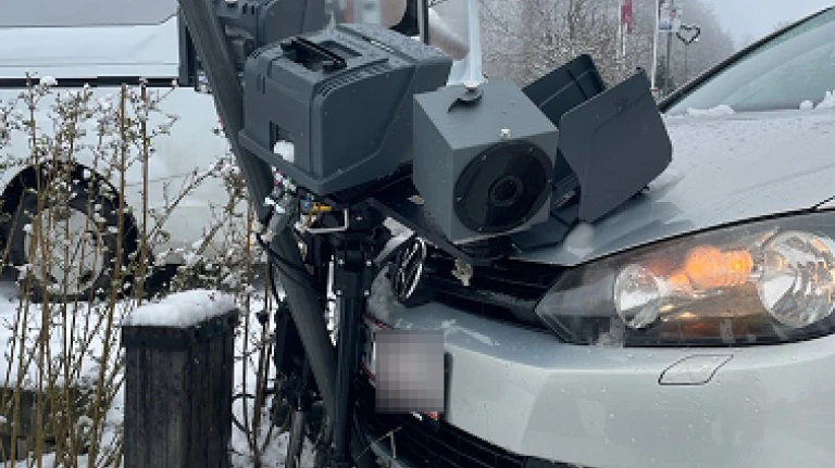 Derfor forsatte bilen med at glide videre på vejen, hvor den bragede ind i selve fotoapparatet, som var stillet frem i vejkanten for.