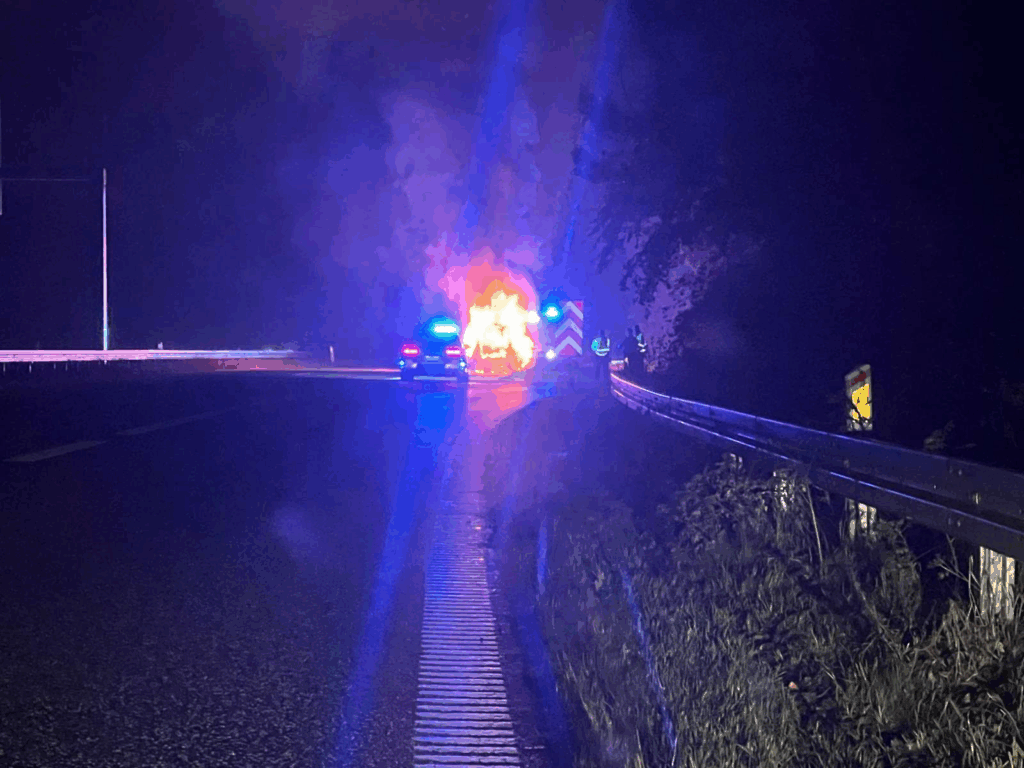 Ifølge vores udsendte skyldes udrykningen, at et køretøj står i brand i motorvejens nødspor.