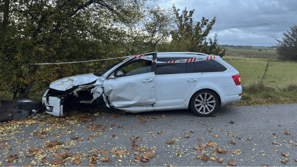 Fredag morgen fik trafikanter på en landevej et chokerende syn, da en personbil stod hårdt medtaget i vejkanten efter at være kørt frontalt ind i et træ.