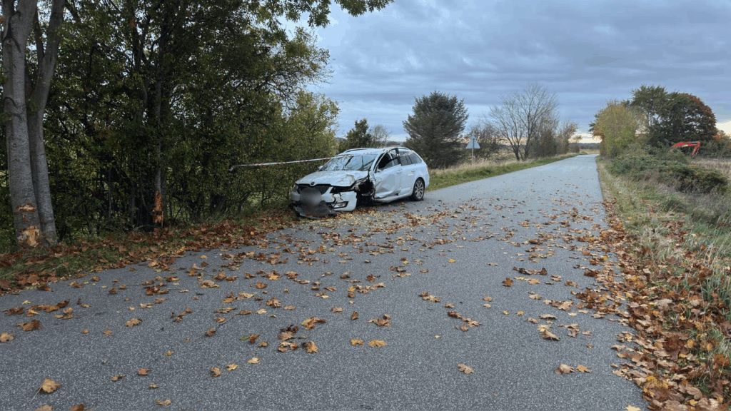 Våde efterårsblade og spredte bildele vidner om et voldsomt sammenstød, der heldigvis ikke kostede liv.
