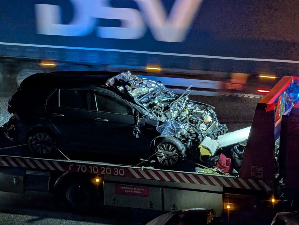 Det er ifølge politiet personbilen, der har påkørt ladvognen i høj fart.