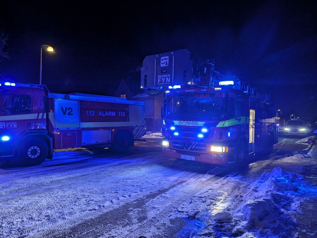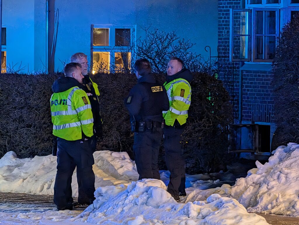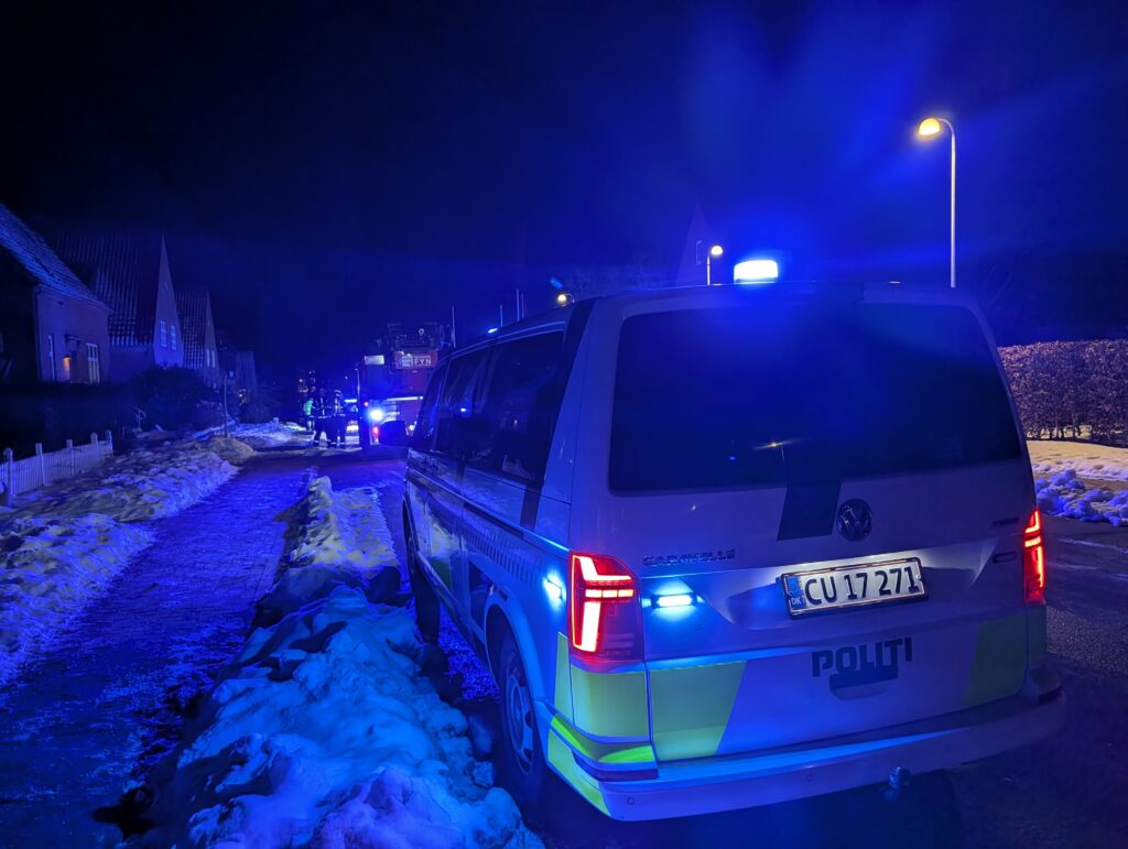 Det er på Dronnings Olgas Vej i Odense, at politi og brandvæsen fortsat arbejder i kulden.