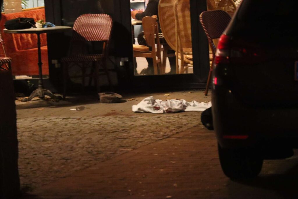 Et blodigt klæde er blevet samlet op og lagt i en bevispose, og der kan ses blod flere steder for biografen.