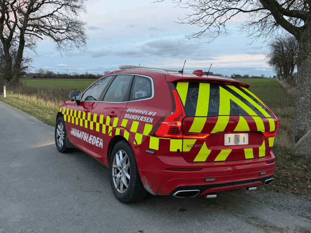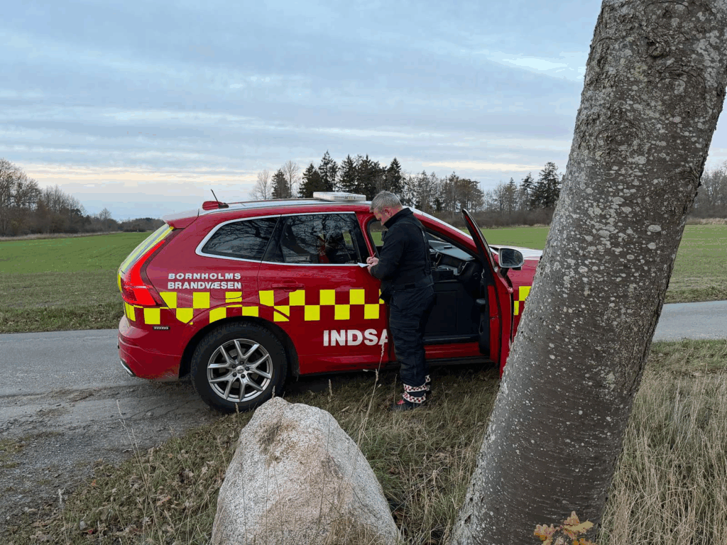 Søndag eftermiddag er en indsatsleder fra Bornhoms Brandvæsen til stede Bodelyngsvejen i Aakirkeby.