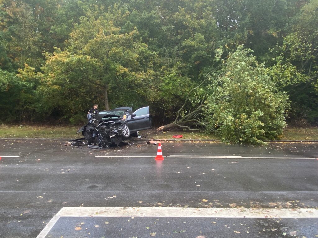 Her er en personbil af mærket BMW kørt af vejen og har forsat frontalt ind i et træ. Træet bliver ved med sammenstødet skåret midt over, mens bilen er totalsmadret.