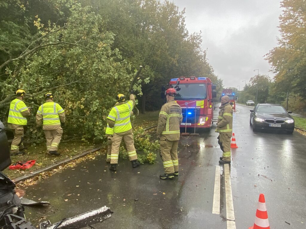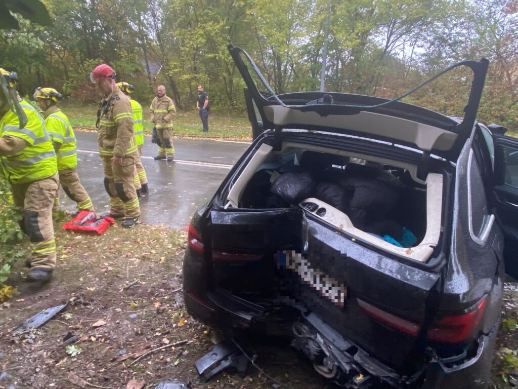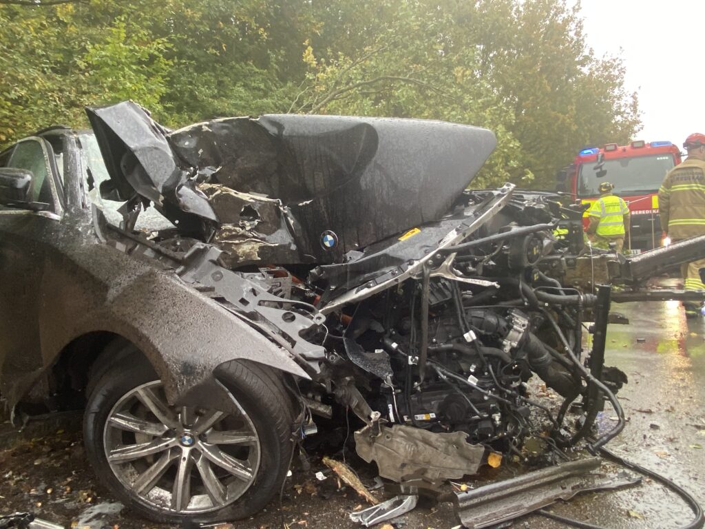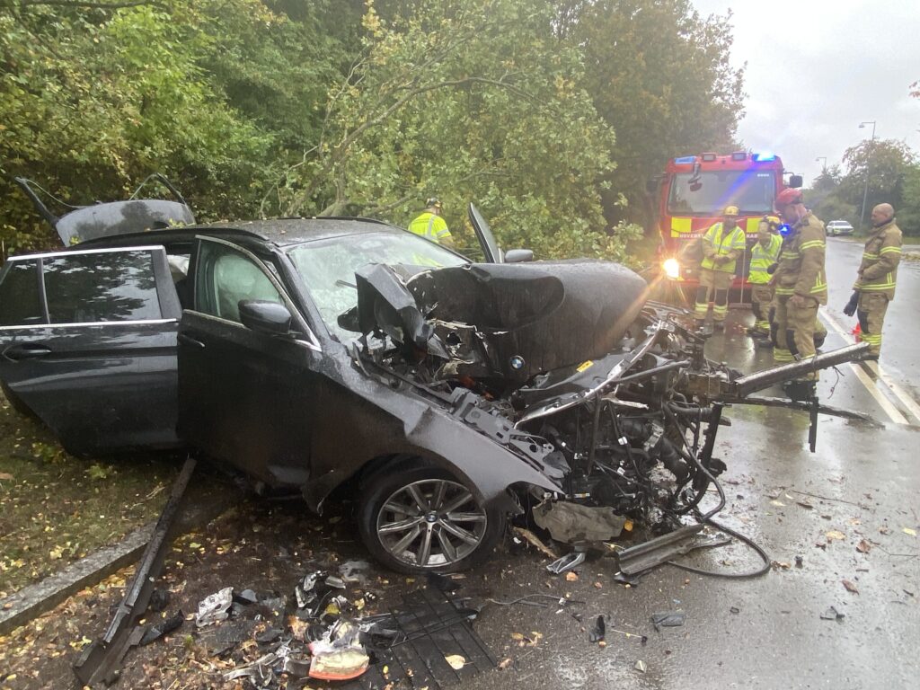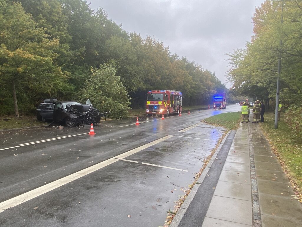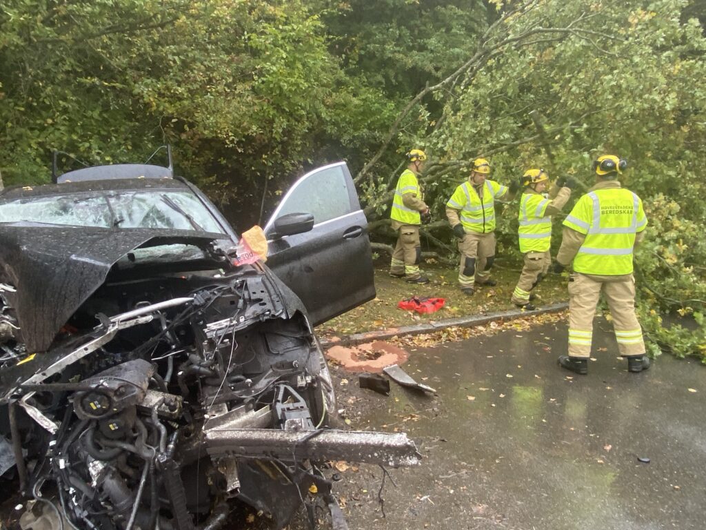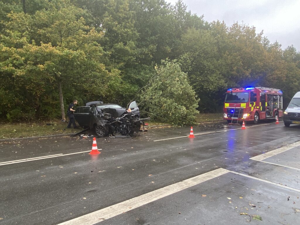 ‘Bilen er kørt af den våde vej og ind i et større træ, som er knækket og ligger på græsset. Bilen er totalsmadret. Brandvæsenet er gået i gang med at skære træet i stykker,’ oplyses der.