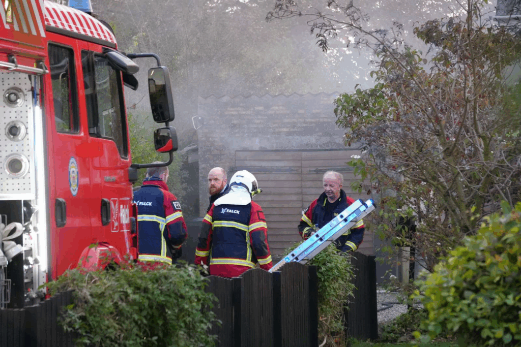 Røg kan ses stige op over kvarteret, mens brandfolk arbejder på stedet med slanger og termiske kameraer.