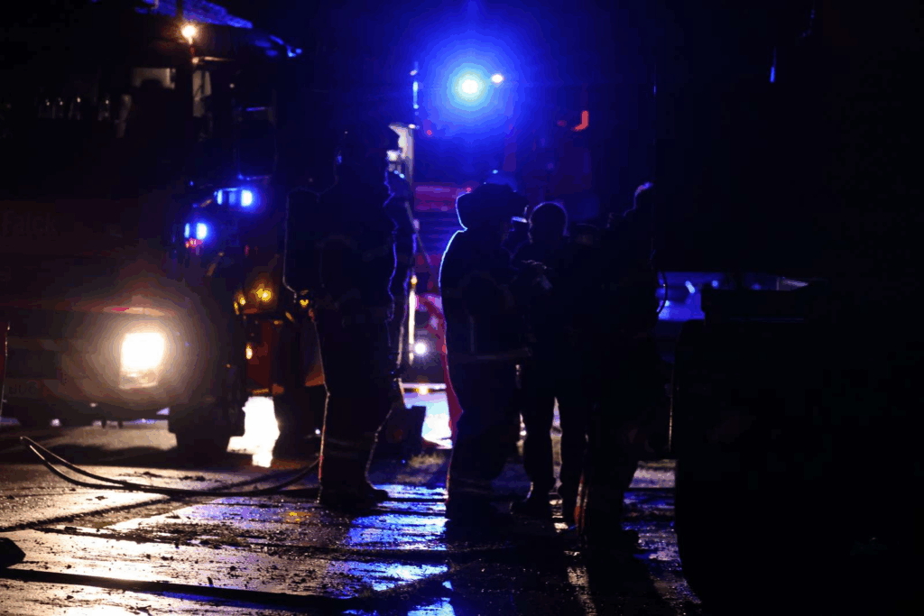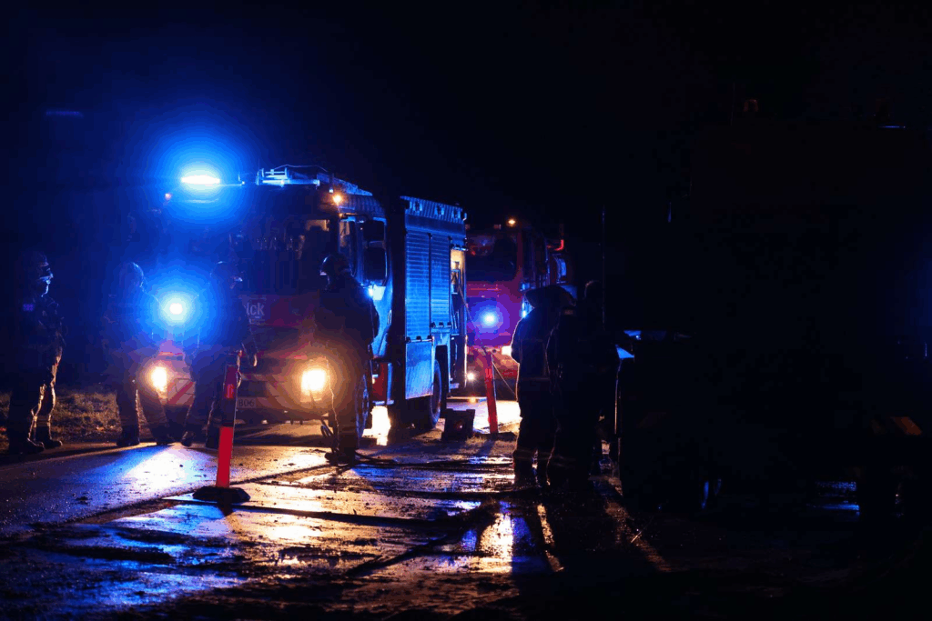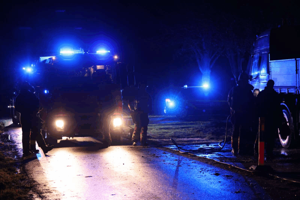 En indsatsleder fra brandvæsnet er til stede sammen med flere køretøjer, og politiet er ankommet for at bistå ved afspærring og undersøgelse af brandårsagen.