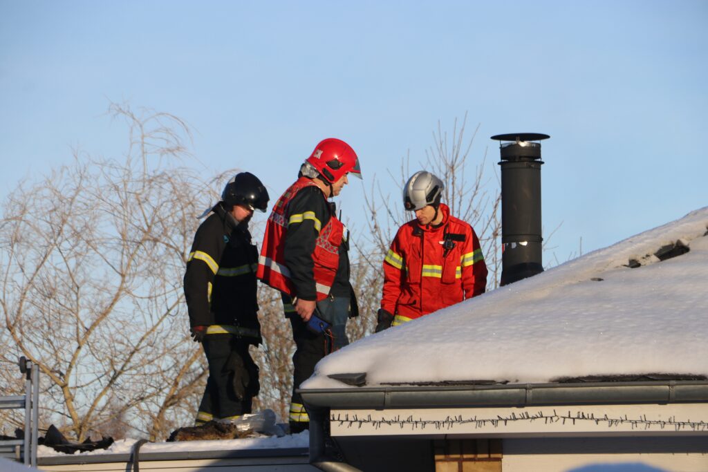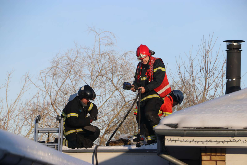 ‘Det havde antændt noget af isoleringen i forbindelse med skorstenen. Vi kunne se, der kom hvid røg ud under taget, så der har måske været noget snefygning ind under taget, og så er det fordampet.’