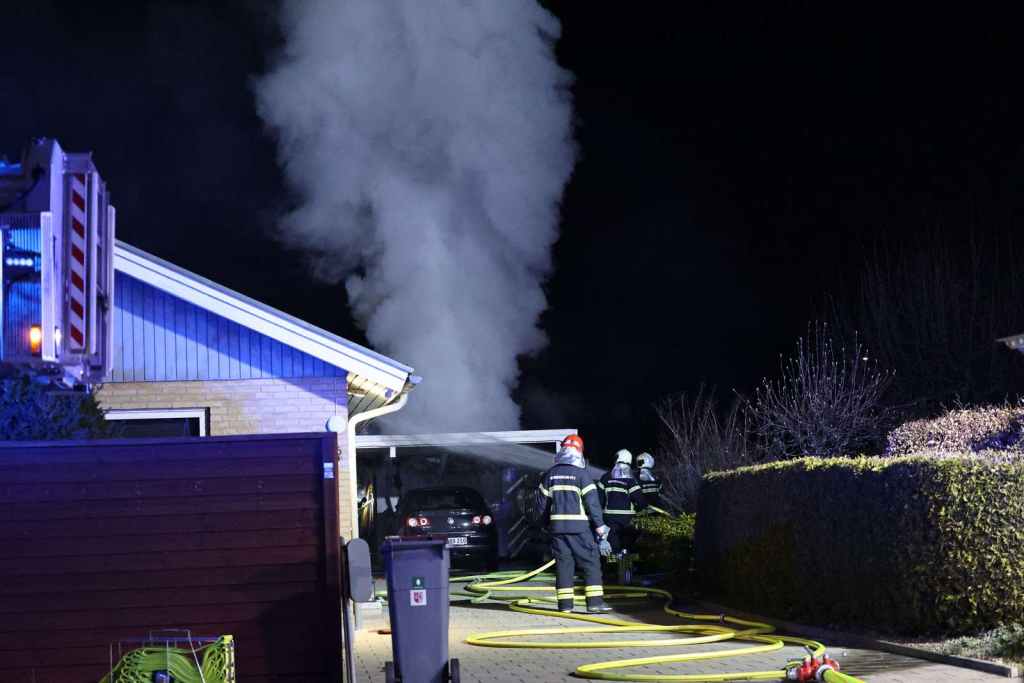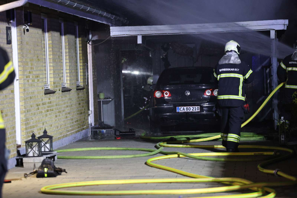 På billeder kan man se, at brandmændene også er rykket ind i garagen.