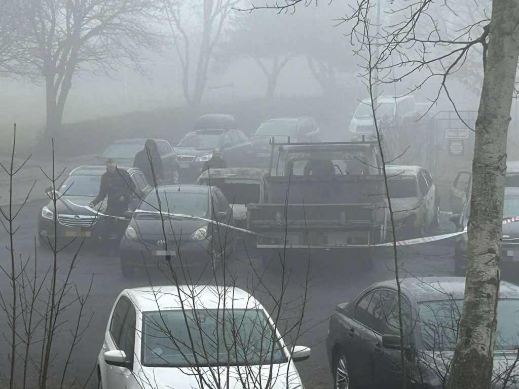 Flere personbiler og en enkelt ladvogn er øjensynligt ofre for hændelsen, hvor nogle af køretøjerne synes at være helt udbrændte.