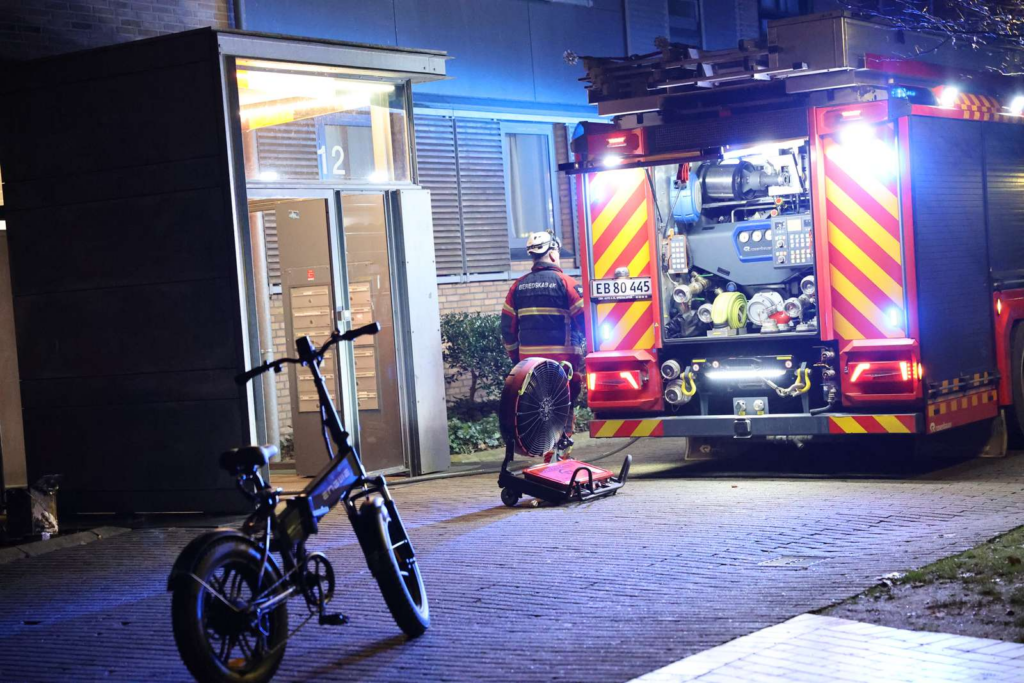 På billeder fra stedet kan brandfolk både ses udrulle brandslanger samt gøre brug af en ventilator, der er rettet mod en opgang.