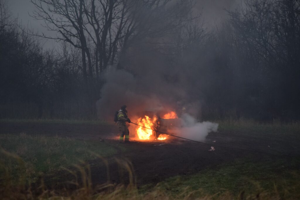 Billeder fra stedet viser høje flammer fra bilen, der er totalt udbrændt, og brandfolk, der arbejder med at få slukket de store flammer.