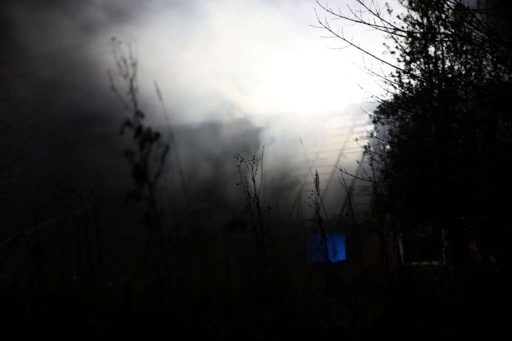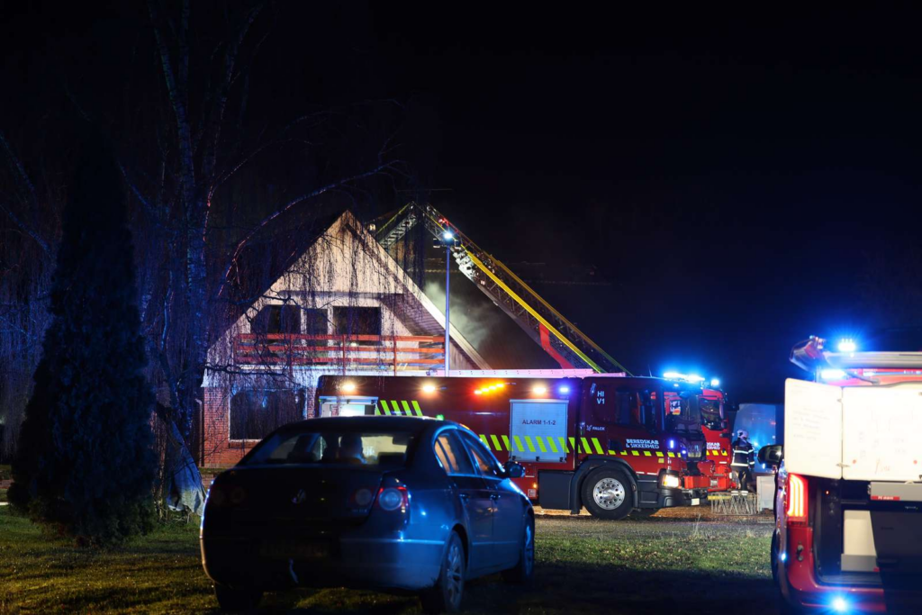 Billeder fra stedet viser, at der fortsat driver røg ud af taget sidst på aftenen, mens brandfolkene fortsat arbejder med slukningen.