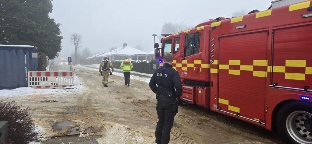 Både politi og brandvæsen er til stede på en adresse, hvor der er meldinger om et brud på en gasledning.