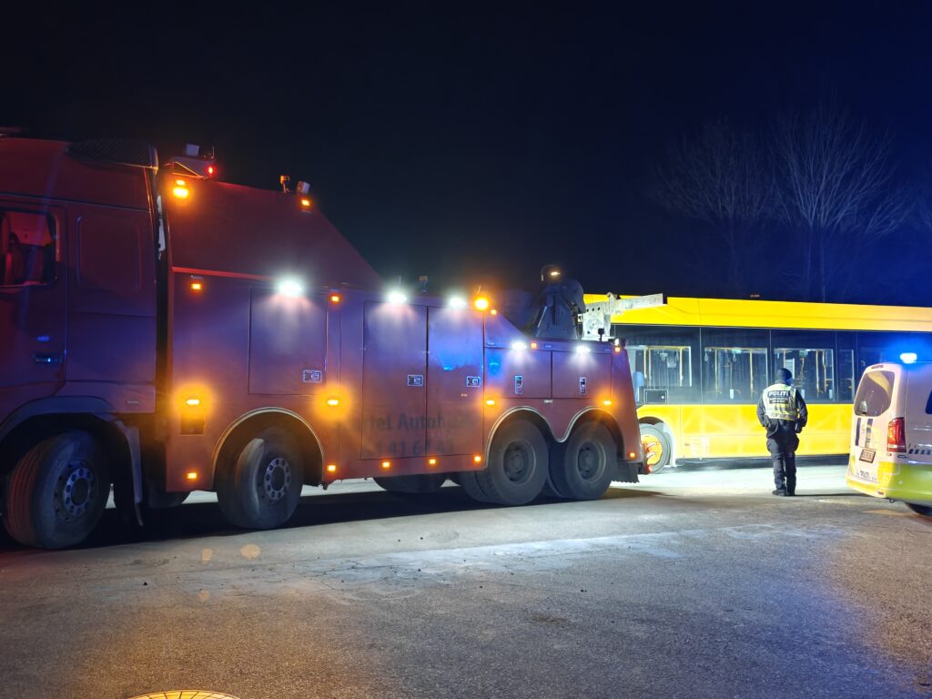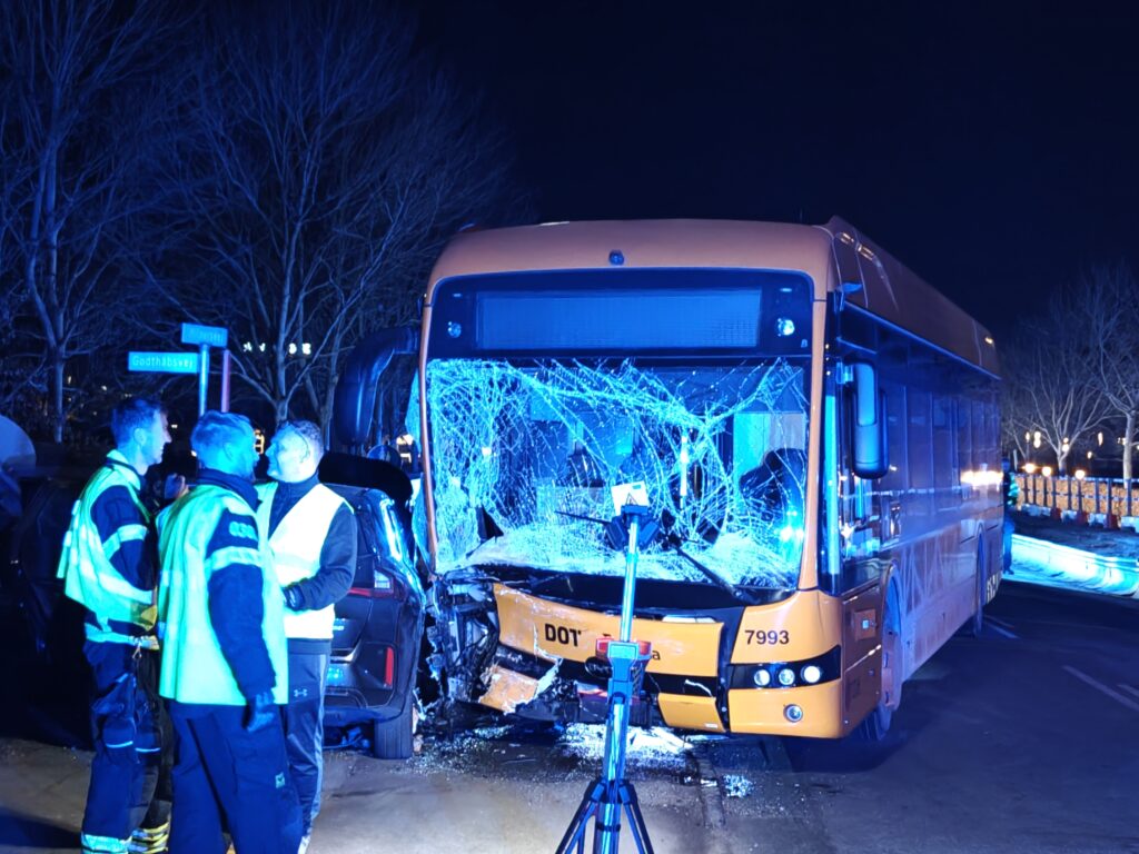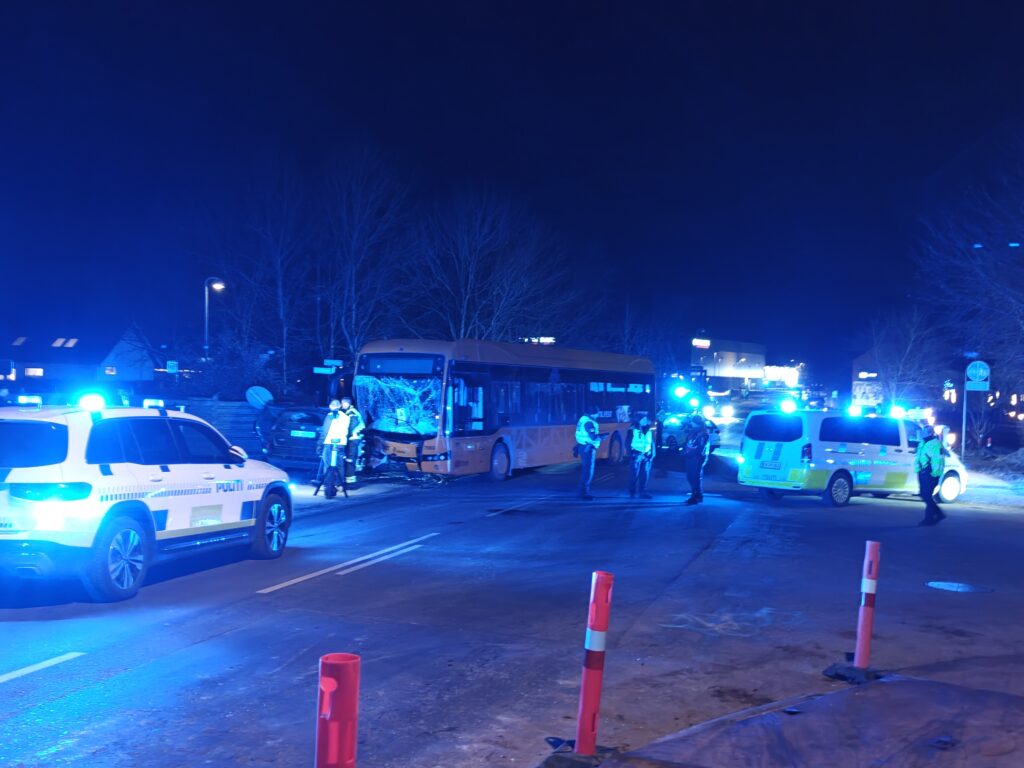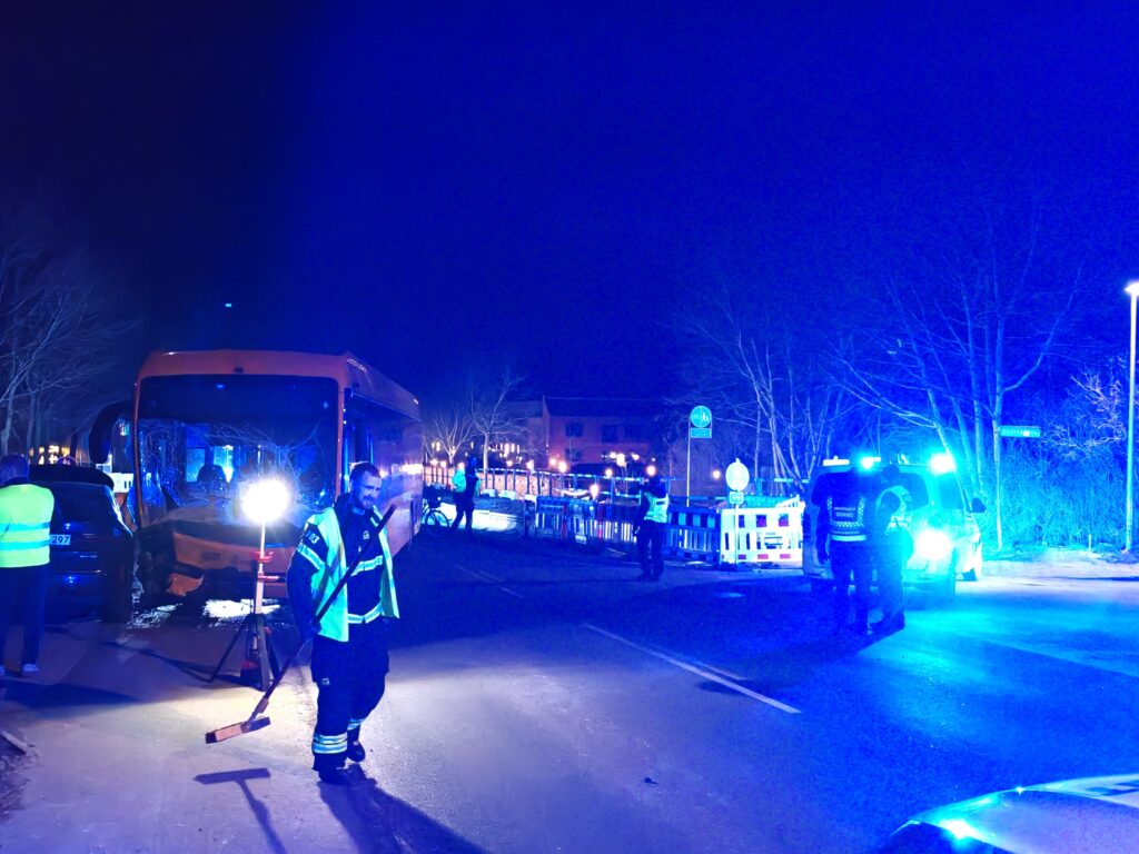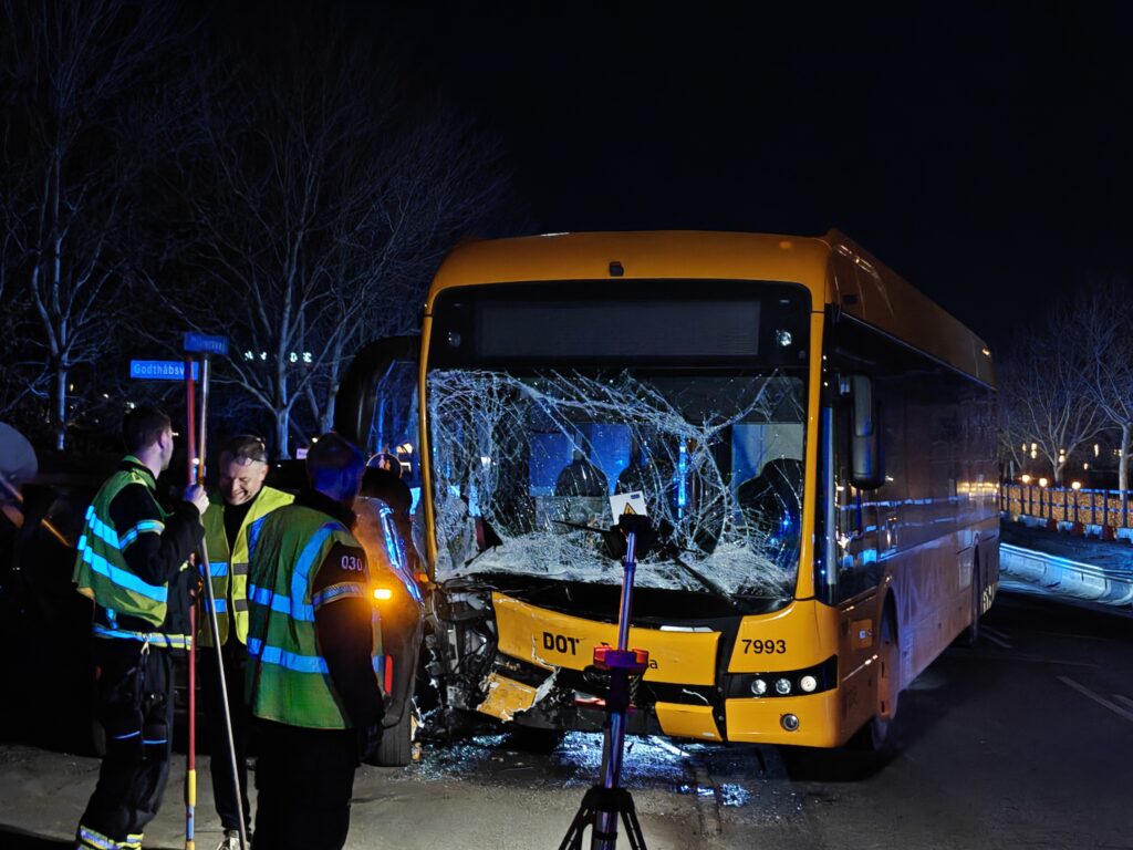 Politi og redning er fremme ved ulykkesstedet, hvorfra billederne viser alvorlige scener med stor materiel skade på især bussen.