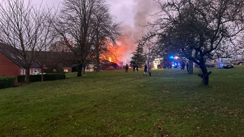 Billeder fra stedet viser, at flammer har godt fat i bygningen, hvorfra en større røgsøjle står op gennem taget.