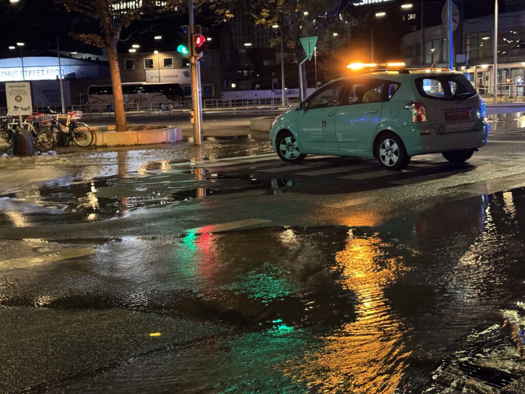 Hændelsen finder helt konkret sted ved rutebilstationen i Aarhus på Sønder Allé. Her arbejder personale og beredskab på at få kontrol over vandmasserne og begrænse skaderne, mens vejen inspiceres for yderligere brud.