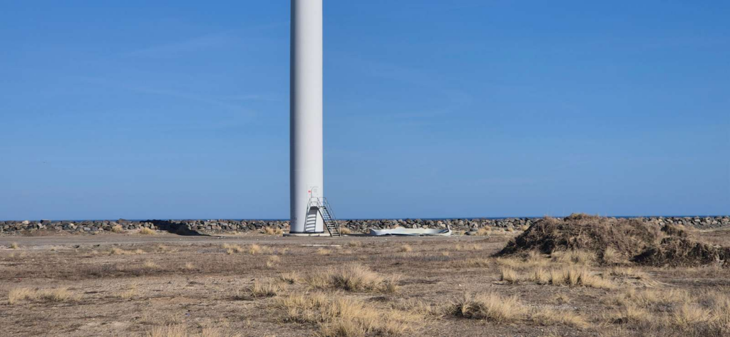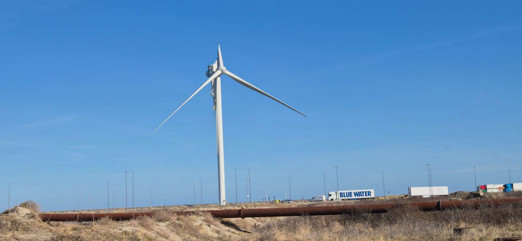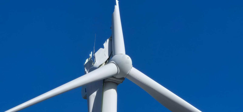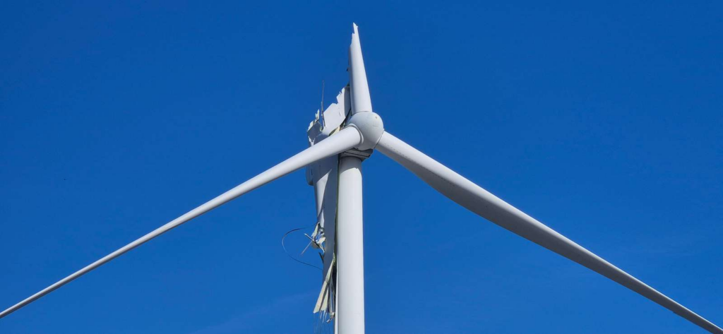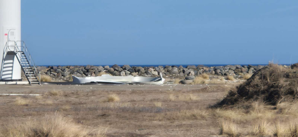 En noget usædvanlig hændelse er sket ved en stor havn, hvor en kæmpemæssig vinge på en 150 meter høj vindmølle pludselig er knækket af