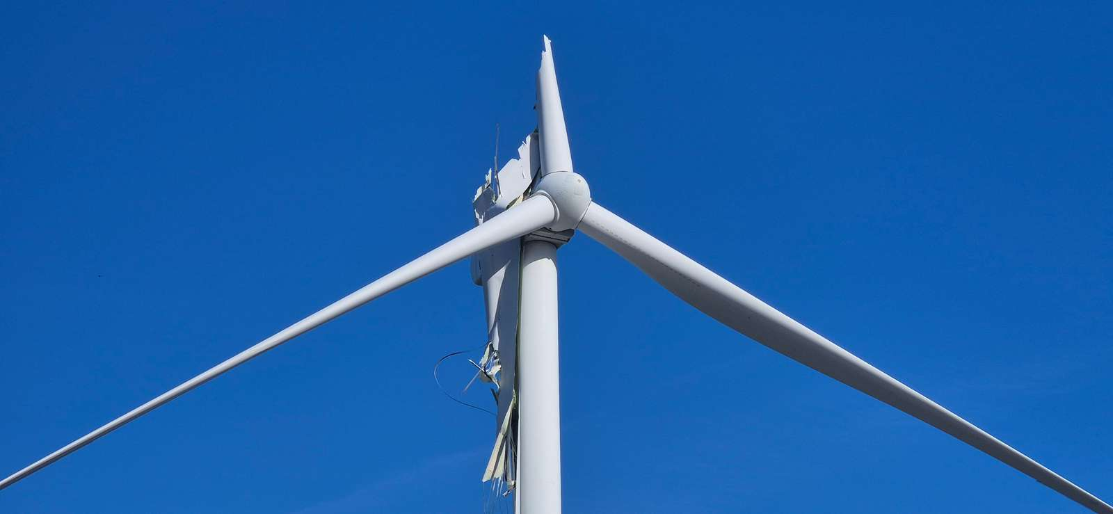 Sådan siger Presse-fotos.dks udsendte torsdag formiddag til en stor vindmølle, som pludselig er knækket.