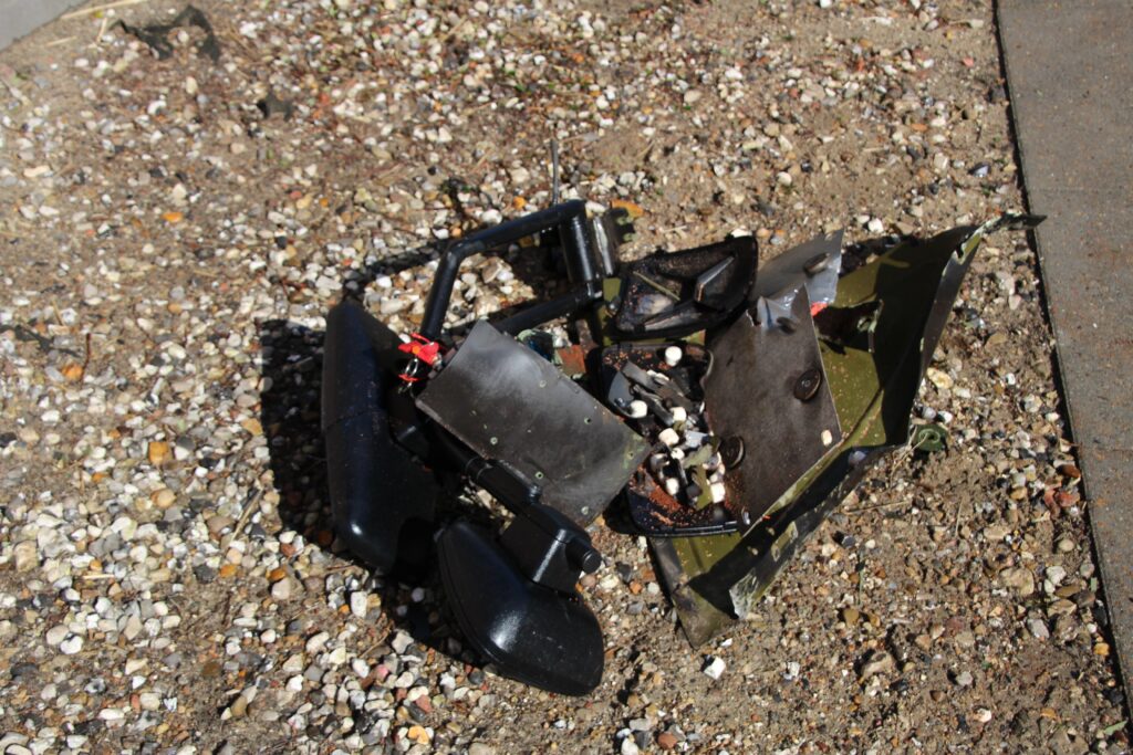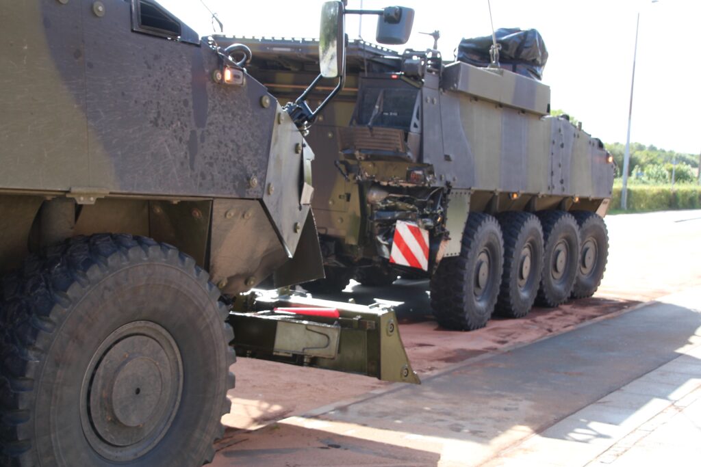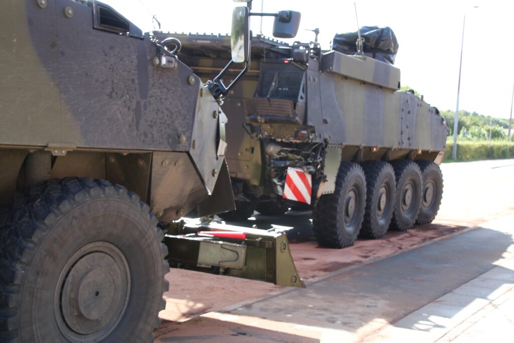 En del af mandskabsvognen ligger derfor på jorden ved siden af militærkøretøjerne.